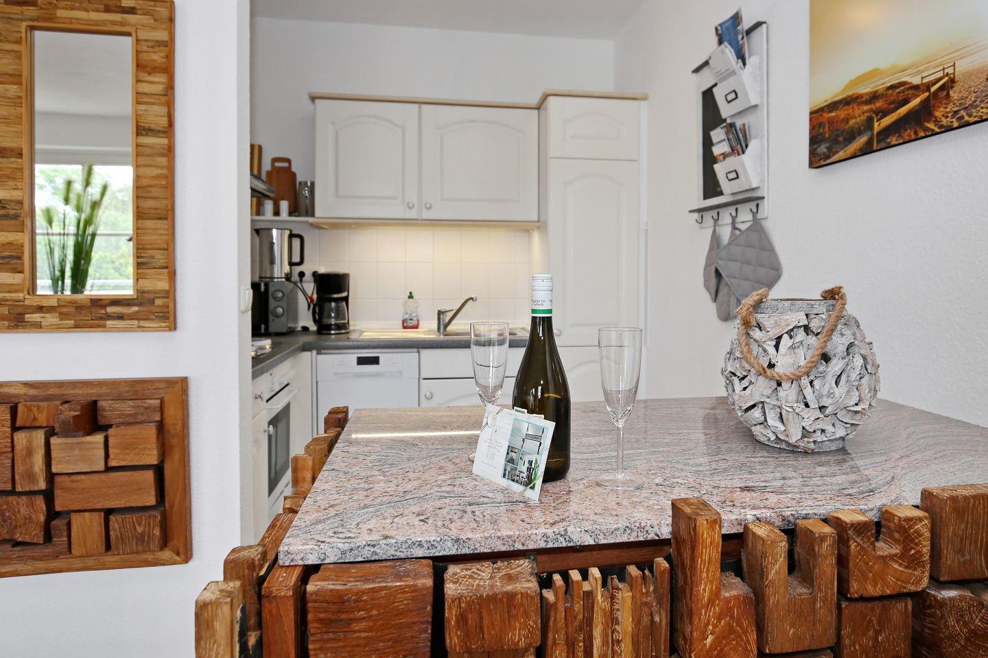 Die komplett eingerichtete Küchenzeile lässt kaum Wünsche offen. Neben einem Backofen, einem 4- Plattenkochfeld, einem Kühlschrank mit Gefrierfach, einem Geschirrspüler, einer Kaffeemaschine und einer Mikrowelle wurde an viele Kleinigkeiten wie zum Beispiel einen Toaster, eine Kaffeemaschine und einen Wasserkocher gedacht.