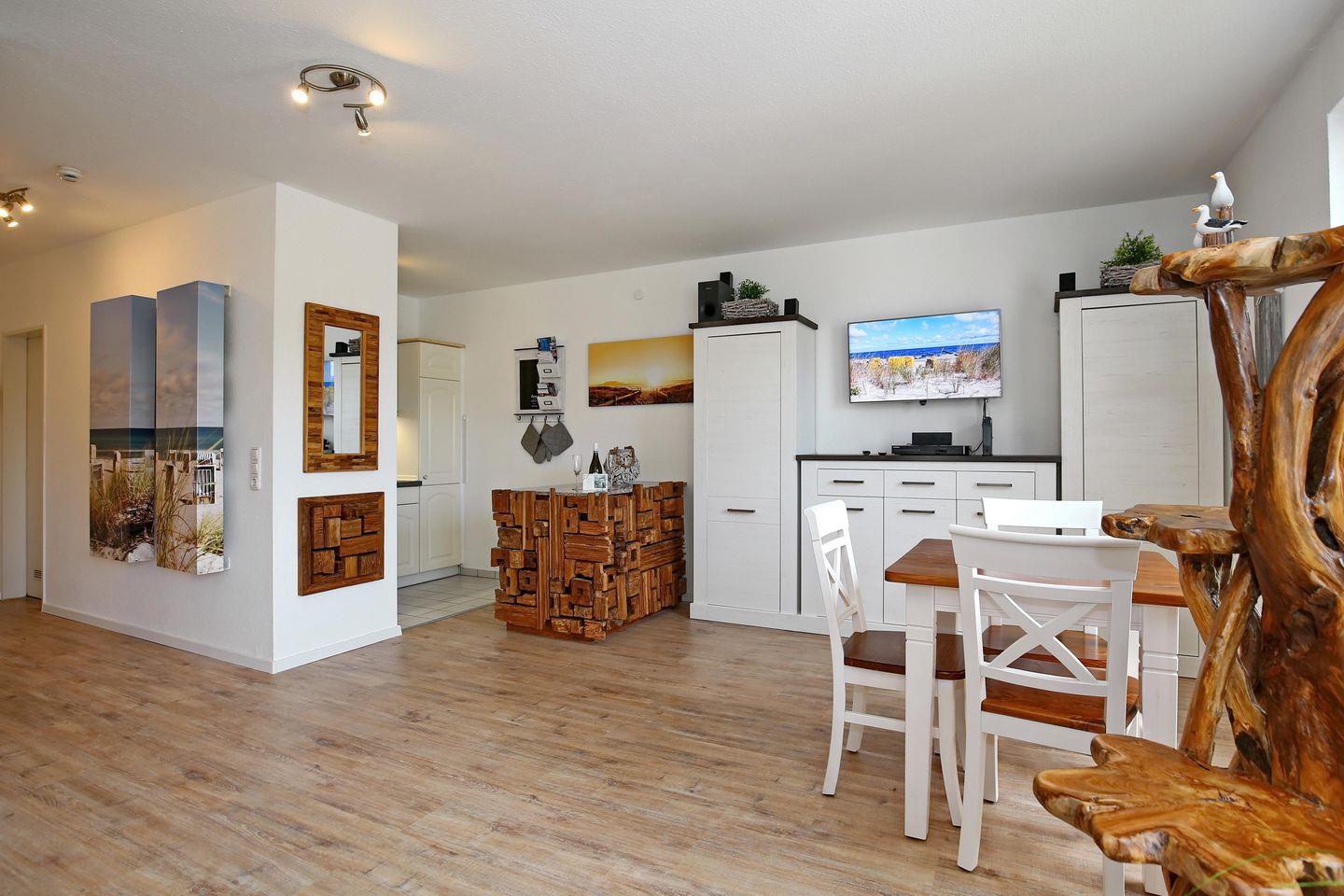 Der liebevoll ausgestattete Wohn- Essbereich lädt zu gemeinsamen Stunden ein. So steht ein gemütliches Schlafsofa (140 x 190 cm), ein Esstisch und ein uriger Tresen zur Verfügung. Ein Flachbild-TV und ein CD- Player komplettieren diesen Bereich. WLAN kannst du kostenfrei in der Ferienwohnung nutzen. An den Fenstern sind Plissees zur Verdunklung angebracht.