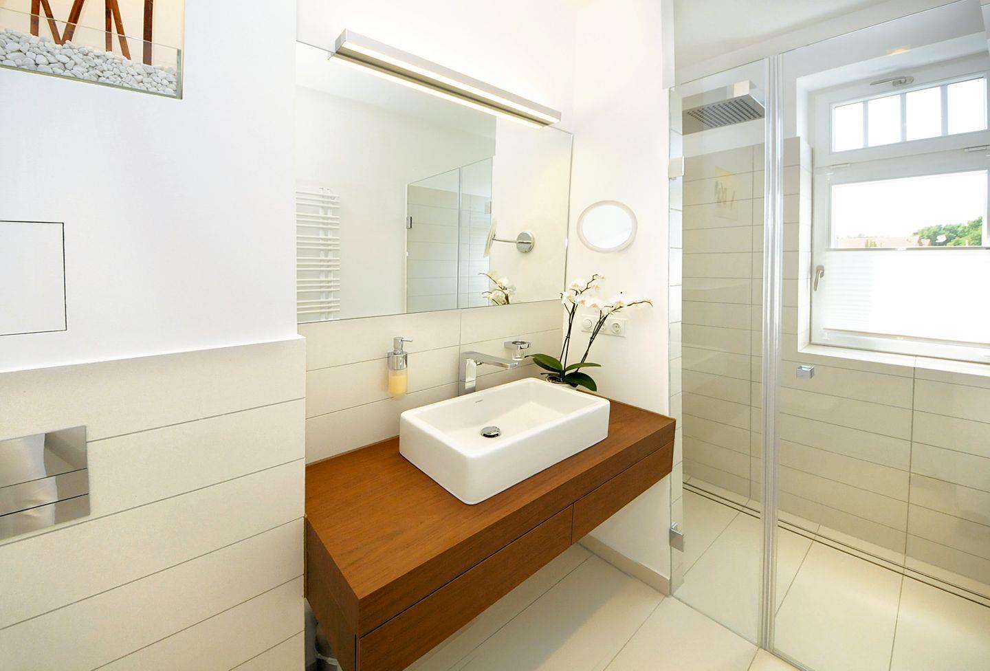 Das geflieste Tageslichtbad ist hell und modern gestaltet. Es verfügt über eine ebenerdige Dusche, ein WC, einen Waschtisch mit Waschbecken, einen großen beleuchteten Spiegel sowie einen Kosmetikspiegel und einen Föhn.