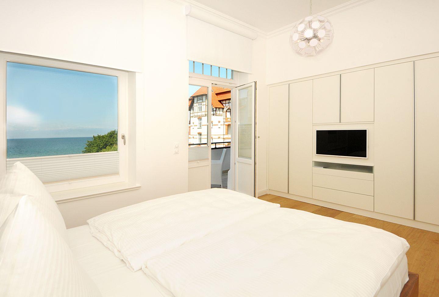 Im Schlafzimmer der Ferienwohnung empfängt dich ein bequemes Doppelbett (180 x 200 cm) zur erholsamen Nachtruhe. Ein großer Kleiderschrank bietet dir genügend Stauraum für dein Urlaubsgepäck. Ein Flachbild-TV sowie ein Blu-Ray-Player sorgen für spätabendliche Unterhaltung. Plissees dienen dir an allen Fenstern als Sichtschutz.