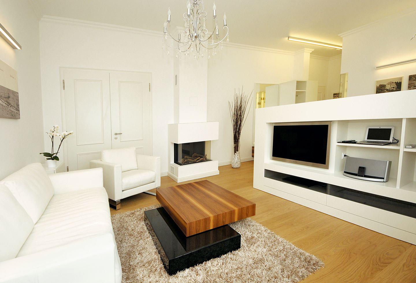 Der stilvolle Wohnbereich der Ferienwohnung lädt dich mit einer gemütlichen Couch und einem Sessel zu geselligen Abendstunden ein. Beste Unterhaltung garantieren dir ein großer Flachbild-TV mit Blu-ray Disc-/DVD-Player. Der Dekokamin (ohne Funktion) trägt zur gemütlichen Atmosphäre des Wohnbereichs bei. Der angrenzende Essbereich bietet dir genügend Platz für deine gemeinsamen Mahlzeiten.