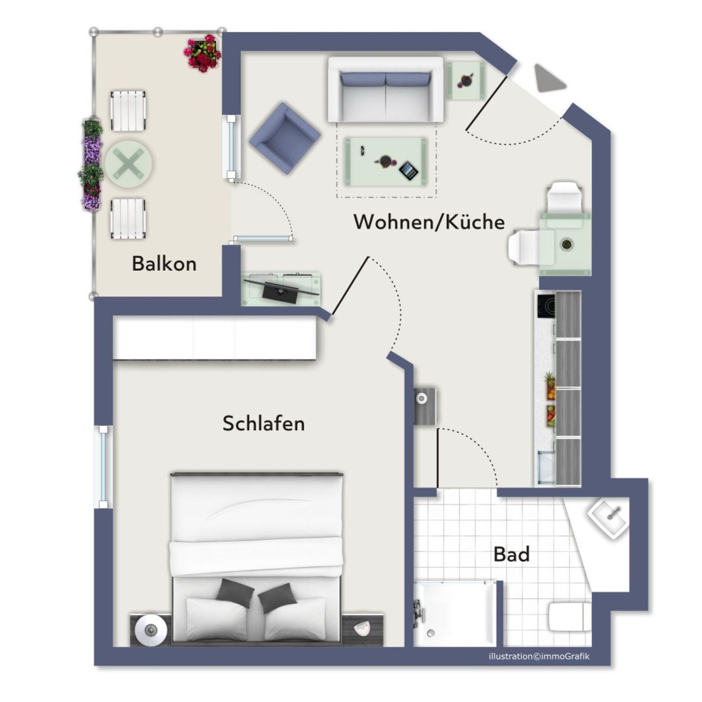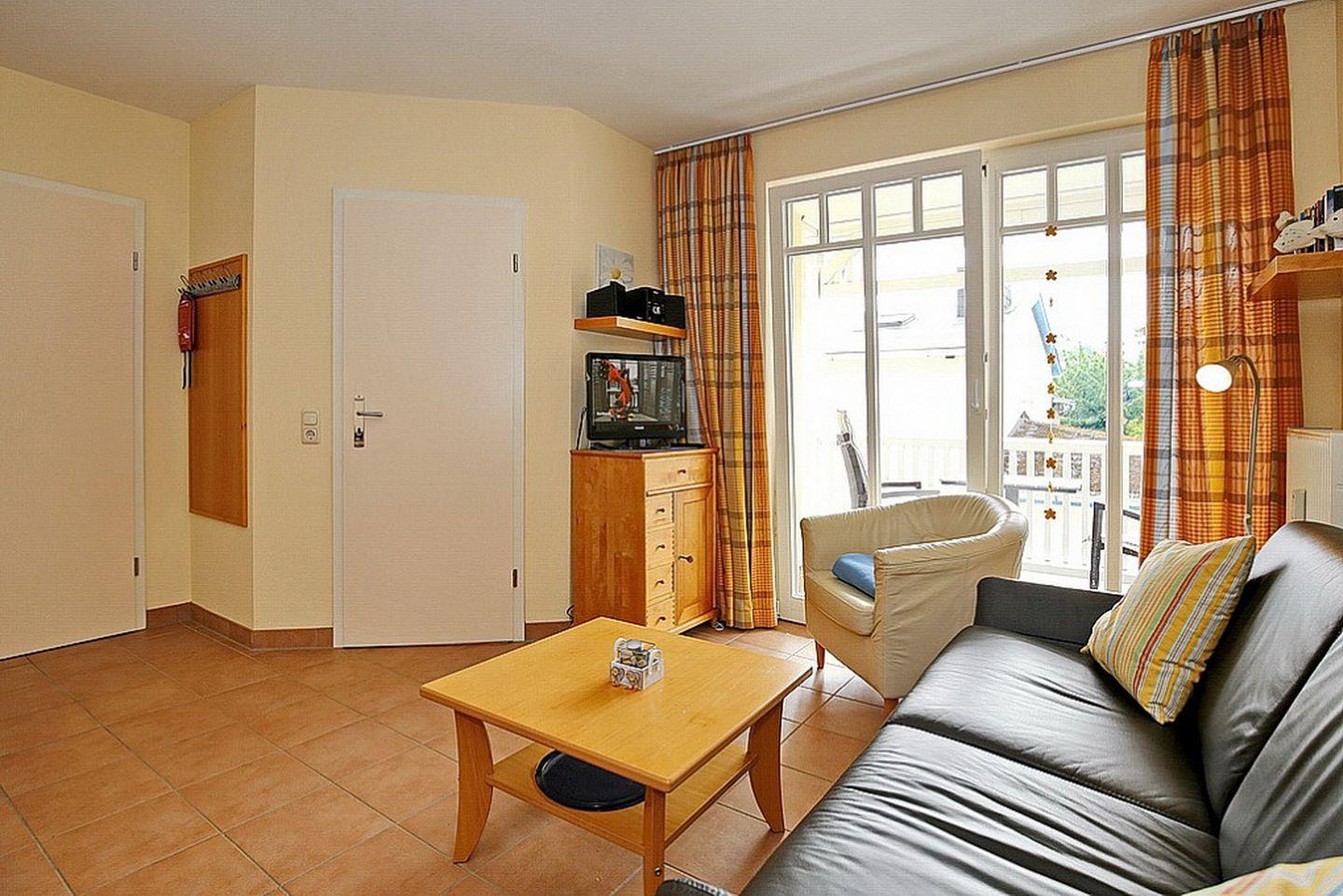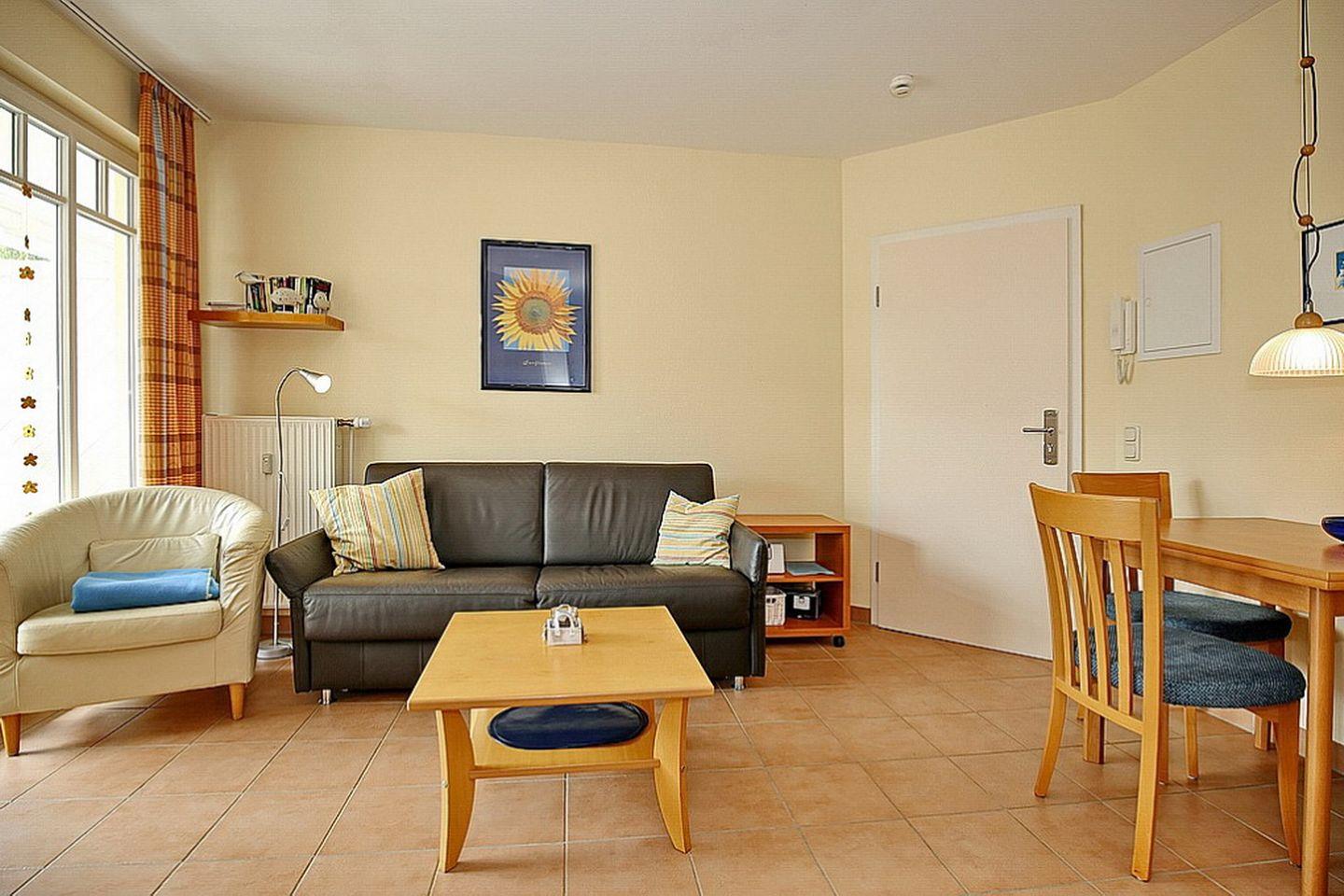 Der Wohnbereich ist für dich mit einer Schlafcouch (120 x 200 cm), einem Couchtisch, einer Kommode und einem Flachbild-TV gemütlich eingerichtet. Von hier aus gelangst du auf den Balkon der Ferienwohnung. Der Essbereich bietet dir ausreichend Platz für gemeinsame Mahlzeiten.