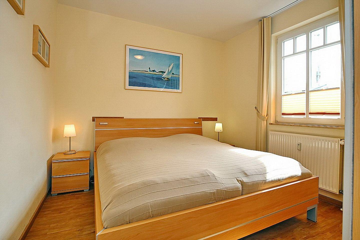 Das Schlafzimmer lädt dich mit einem bequemen Doppelbett (2 x 90 x 200 cm) zur erholsamen Nachtruhe ein. Ein Kleiderschrank bietet dir hier Stauraum für dein Urlaubsgepäck. Das Schlafsofa im Wohnbereich der Ferienwohnung wird schnell zu einem bequemen Schlafplatz für die dritte Person. Vorhänge dienen dir als Sichtschutz oder zum Verdunkeln.