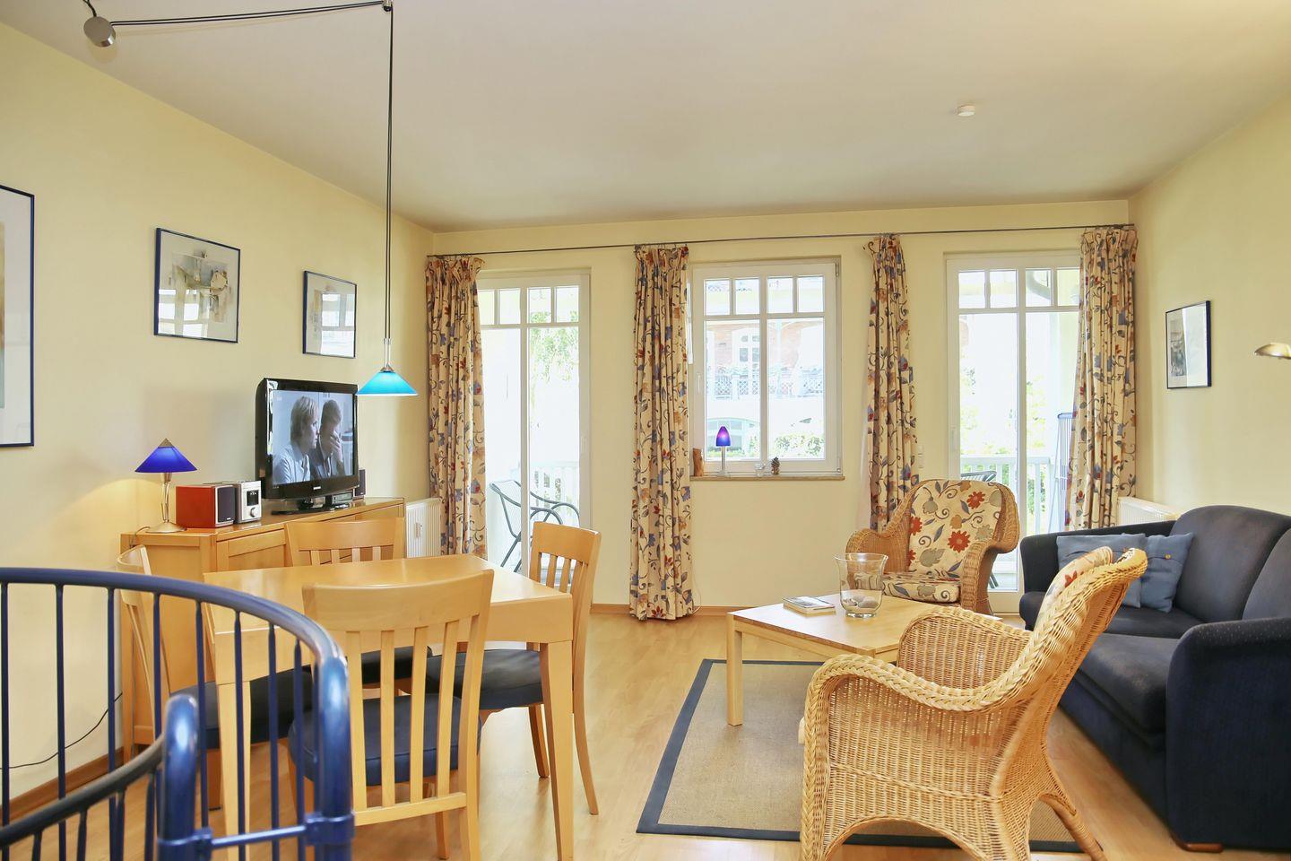 Im Wohn- und Essbereich findest du ein Doppelschlafsofa (140 x 200 cm), zwei Korbsessel und einen Esstisch mit vier Stühlen vor. Der Flachbildfernseher komplettiert diesen Bereich. Der hier ausgelegte Laminatboden verleiht eine angenehme Atmosphäre. Von hier aus gelangst du auf den Balkon.