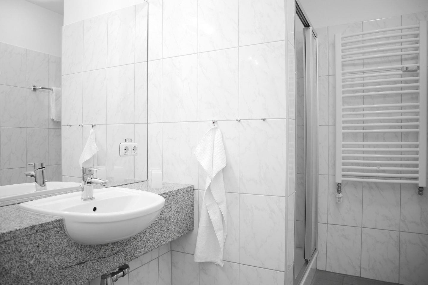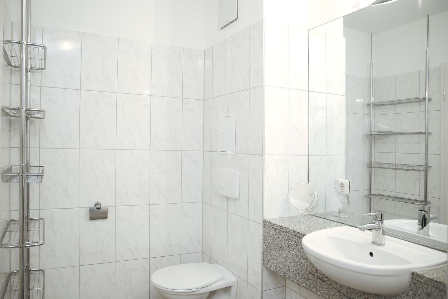 Auf dieser Ebene befindet sich auch das geflieste Badezimmer mit Föhn, Kosmetikspiegel, Dusche, Waschbecken und WC.