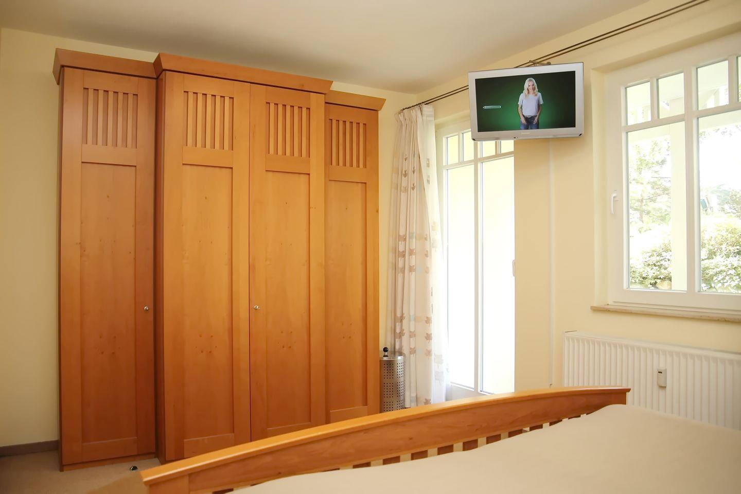Das nach unten führende Schlafzimmer beherbergt ein Doppelbett (2 x 90 x 200 cm), in dem du erholsamen Schlaf findest. In dem geräumigen Kleiderschrank findet deine Urlaubsgarderobe genügend Stauraum. Ein weiterer Fernseher steht dir hier zur Verfügung. Das Schlafzimmer ist mit PVC ausgelegt. Der angrenzende Balkon lädt zu gemütlichen Stunden ein.