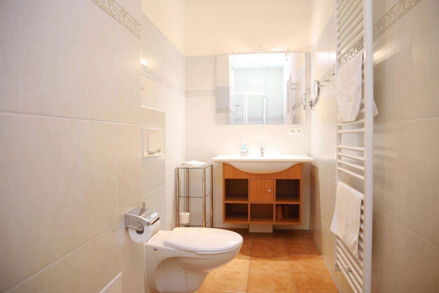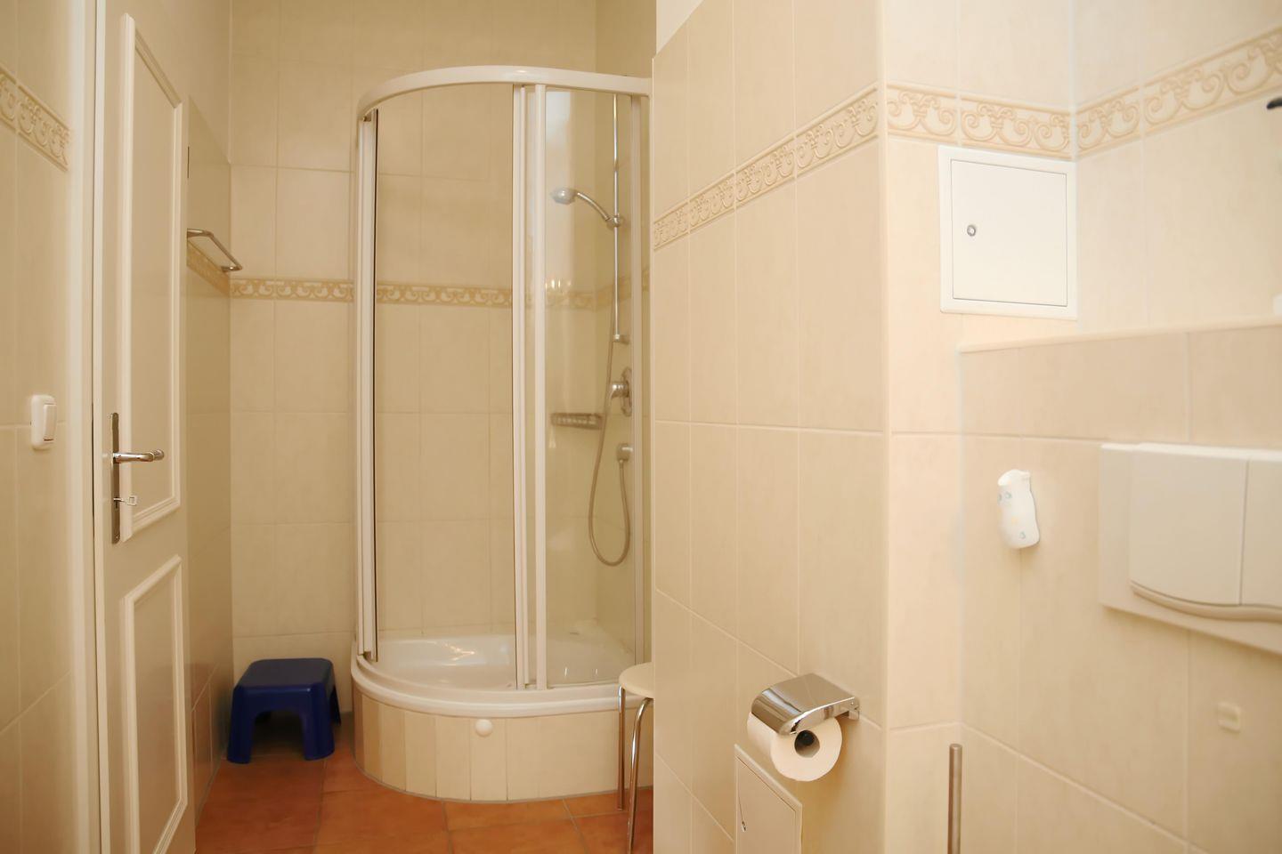 Das geflieste Bad verfügt über eine Dusche, einen Kosmetikspiegel, einen Föhn und ein WC. Folgende Bodenbeläge sind in den Räumen der Ferienwohnung verlegt: im Schlaf- und Kinderzimmer Vinyl und im Wohnbereich Fliesen. In dieser Nichtraucherwohnung sind Haustiere erlaubt.