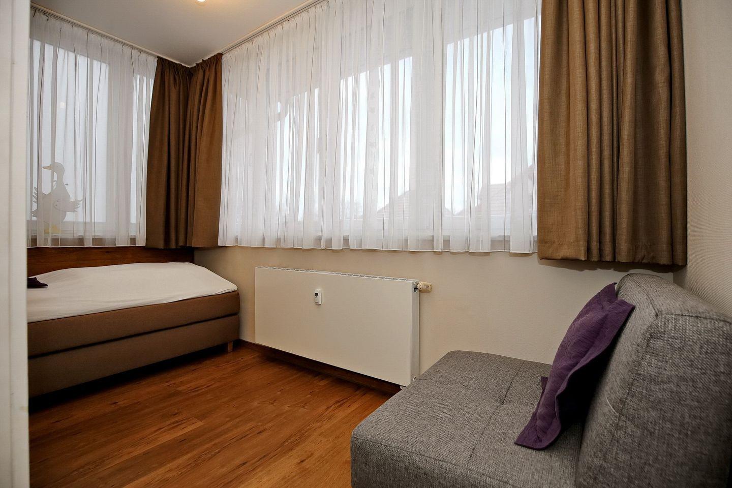 Im Schlafzimmer der Ferienwohnung erwartet dich ein Boxspringbett (180 x 200 cm). Ein Kleiderschrank bietet dir Stauraum für dein Urlaubsgepäck. Das zweite Schlafzimmer ist für dich mit einem Boxspringbett (1 x 90 x 200 cm) und einem Klappbett (1 x 80 x 200 cm) eingerichtet. Vorhänge dienen dir als Sichtschutz und zum Verdunkeln.