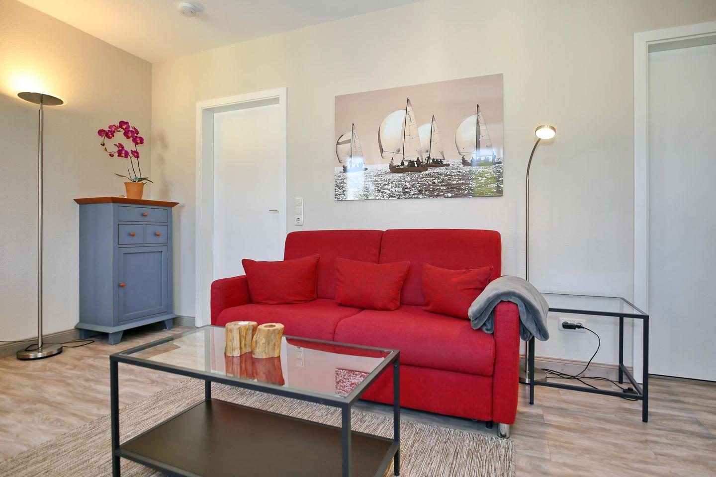 Im Wohnbereich erwartet dich ein komfortables Sofa sowie ein Flachbild-TV und eine Stereoanlage.