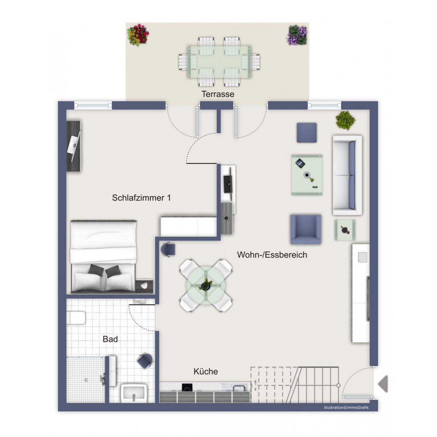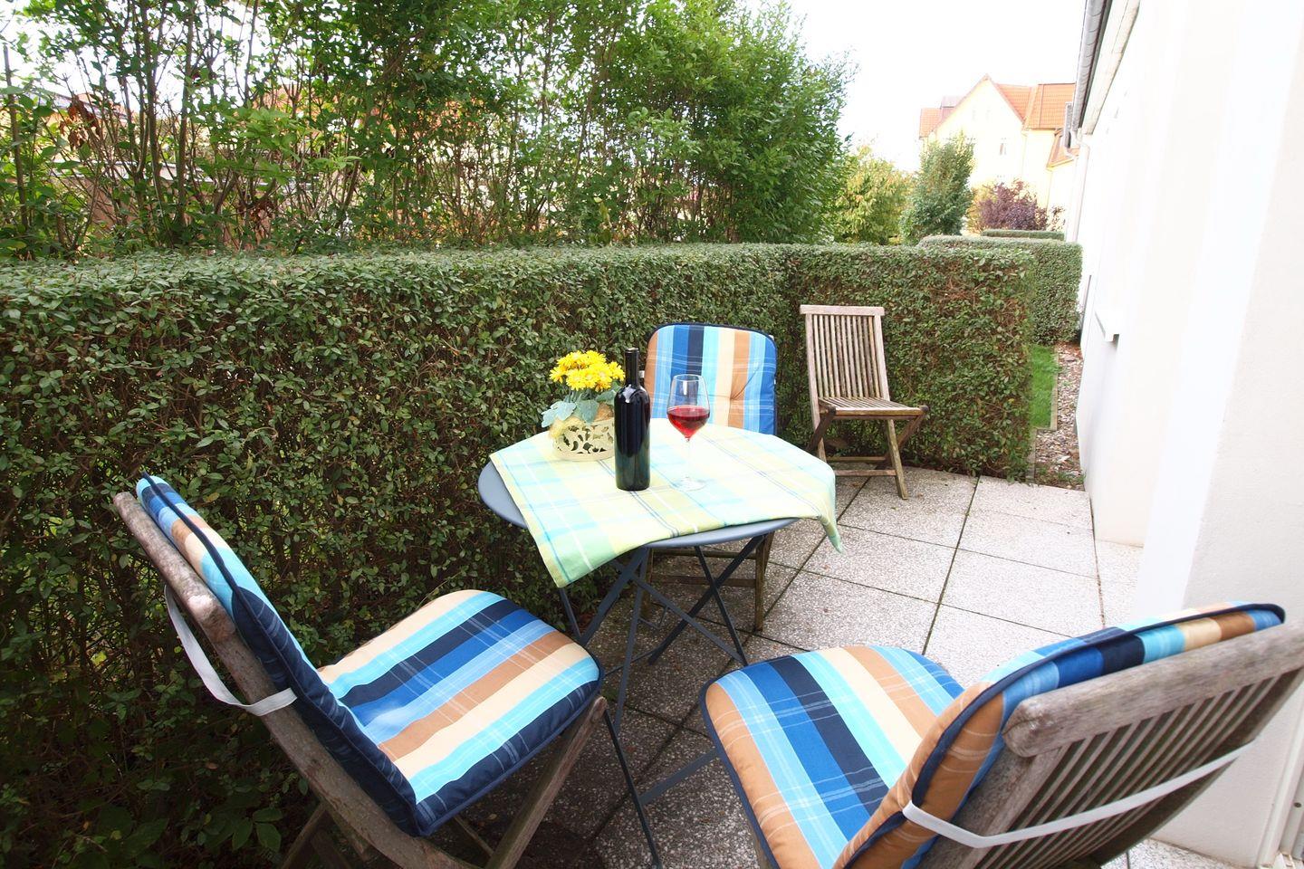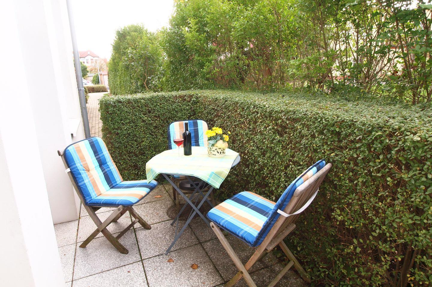 Die Nachmittagssonne lässt sich auf der begrünten Terrasse, welche sowohl über das Schlafzimmer als auch über das Wohnzimmer erreichbar ist, genießen.