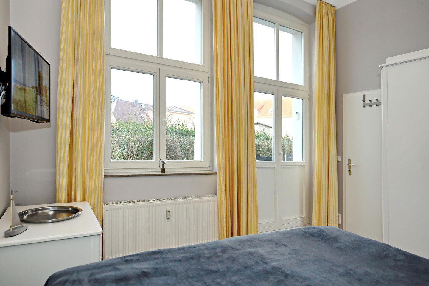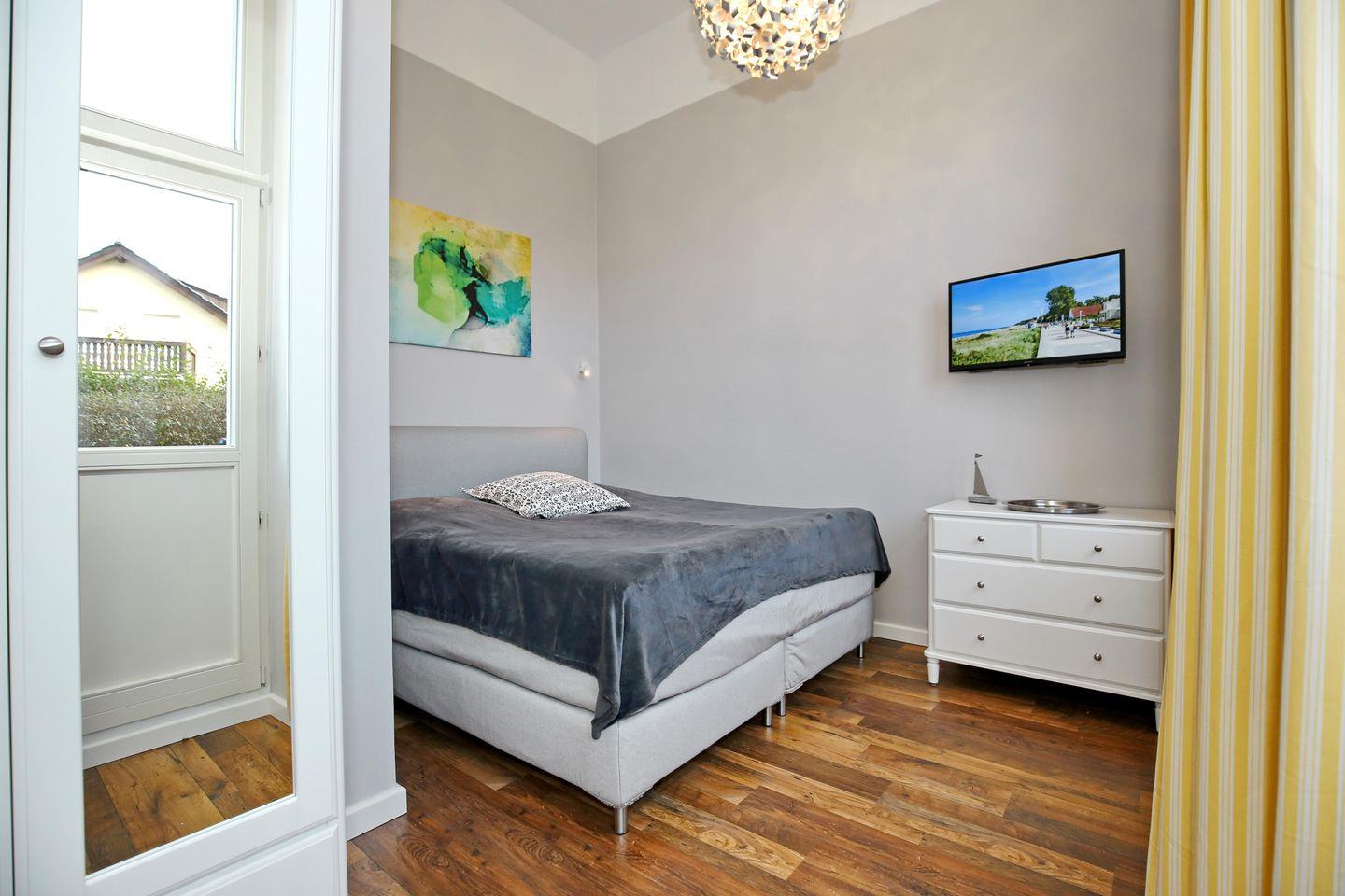 Im komfortabel eingerichteten Schlafzimmer befindet sich ein großes Boxspringbett (180 x 200 cm), ein 2. Flachbild-TV sowie Nachttische und ein Kleiderschrank. Für die kleinen Gäste steht ein Kinderreisebett mit Matratze bereit.