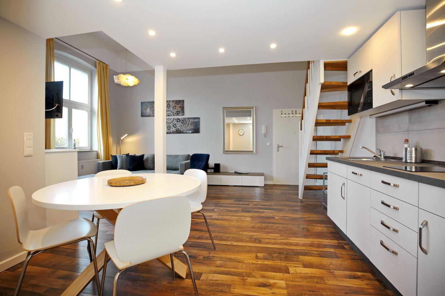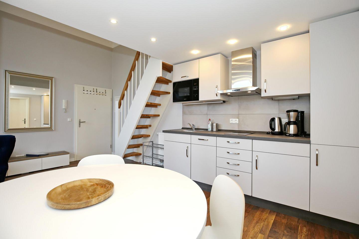 Die Küchenzeile der Ferienwohnung ist für dich mit einem 2-Zonen-Cerankochfeld, einem Kühlschrank mit Gefrierfach sowie einem Geschirrspüler und einer Mikrowelle voll ausgestattet. Kleingeräte, wie ein Toaster, eine Kaffeemaschine, eine Kaffeekapselmaschine (Nespresso Essenza Mini) und ein Wasserkocher, vervollständigen die Kücheneinrichtung. Am runden Esstisch haben 4 Personen Platz. Für die kleinen Gäste steht ein Kinderhochstuhl bereit.