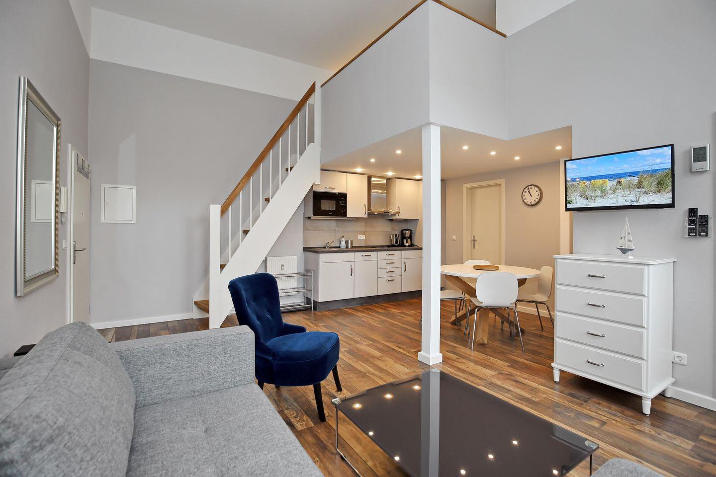 In der Wohnung erwarten dich ein gemütlicher Wohnbereich mit Küchenzeile, ein separates Schlafzimmer, eine Galerie/Empore mit weiterem Doppelbett als Rückzugsmöglichkeit, ideal für Kinder, ein Duschbad und eine möblierte Terrasse.