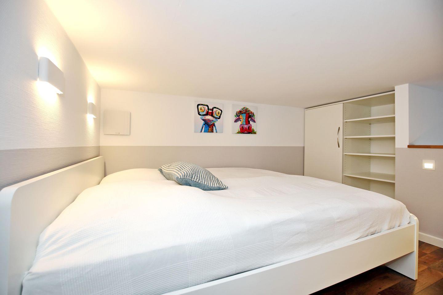 Zusätzlich bietet die Wohnung eine Galerie/Empore mit einem zusätzlichen Doppelbett (180 x 200 cm). Die Deckenhöhe beträgt hier ca. 1,55-1,60 Meter und ist ideal als Rückzugsmöglichkeit für Kinder. Ein Rausfallschutz für Kinder im großen Doppelbett steht bereit. Ferner ist die Treppe zur Empore mit einem Kinderschutzgitter ausgerüstet, das du bei Bedarf ausziehen kannst.