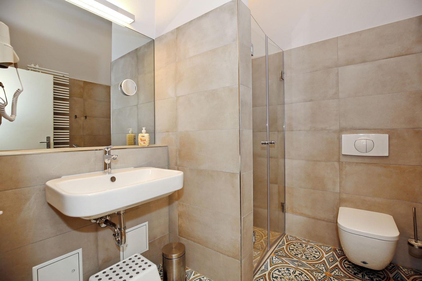 Das Badezimmer verfügt über eine ebenerdige Dusche, ein Waschbecken und ein WC. Der große beleuchtete Wandspiegel sorgt für ein angenehmes Licht. Zum Trocknen und Aufhängen deiner Handtücher ist eine Wandheizung vorhanden. Ein Föhn sowie ein Hocker für die kleinen Gäste komplettieren das Bad.