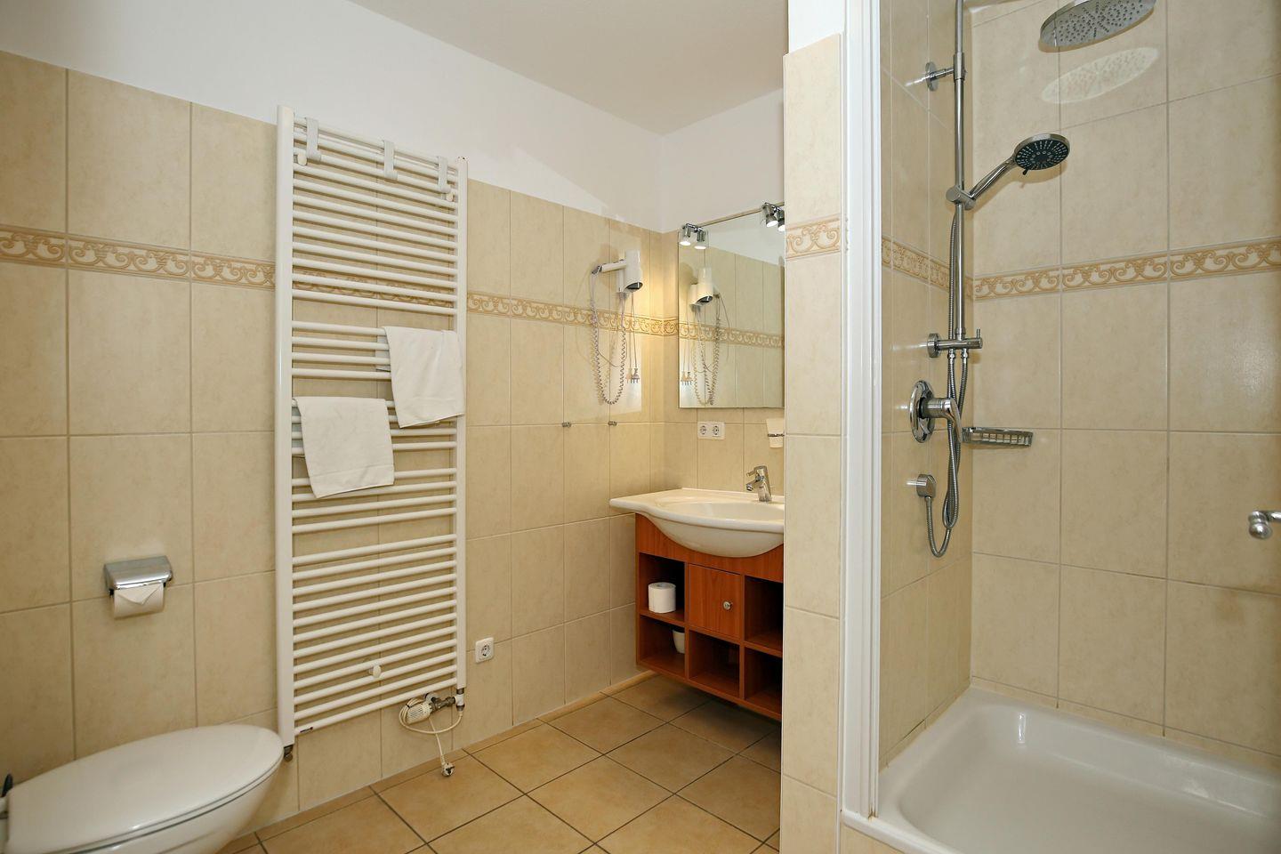 Das geflieste Duschbad ist funktional mit einem Waschtisch, Handtuchheizkörper, WC und Spiegel sowie Föhn ausgestattet. In der gesamten Wohnung sind Feinsteinfliesen verlegt. In dieser Nichtraucherwohnung sind Haustiere gestattet.