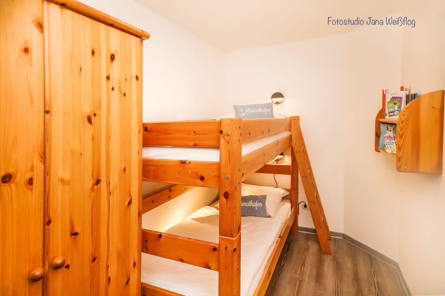In den zwei gemütlichen Schlafzimmern der Ferienwohnung kannst du dich erholen. Das erste Schlafzimmer verfügt über ein Doppelbett (2 x 90 x 200 cm) und einen großen Schrank. Im zweiten Schlafzimmer steht ein bequemes Etagenbett (90 x 200 cm) und ein kleiner Kleiderschrank. An den Fenstern sind Vorhänge angebracht.