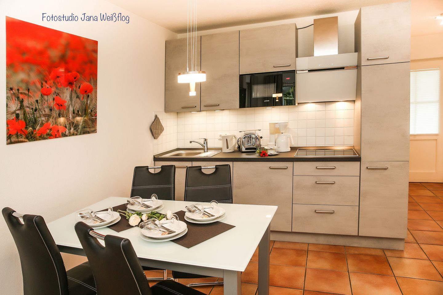Die komplett eingerichtete Küchenzeile mit Cerankochfeld, Mikrowelle, Geschirrspüler und Kühlschrank ist in den Wohnbereich integriert. Eine Kaffeemaschine, ein Wasserkocher und ein Toaster sind selbstverständlich auch vorhanden. Am gegenüberliegenden Esstisch haben 4 Personen Platz.