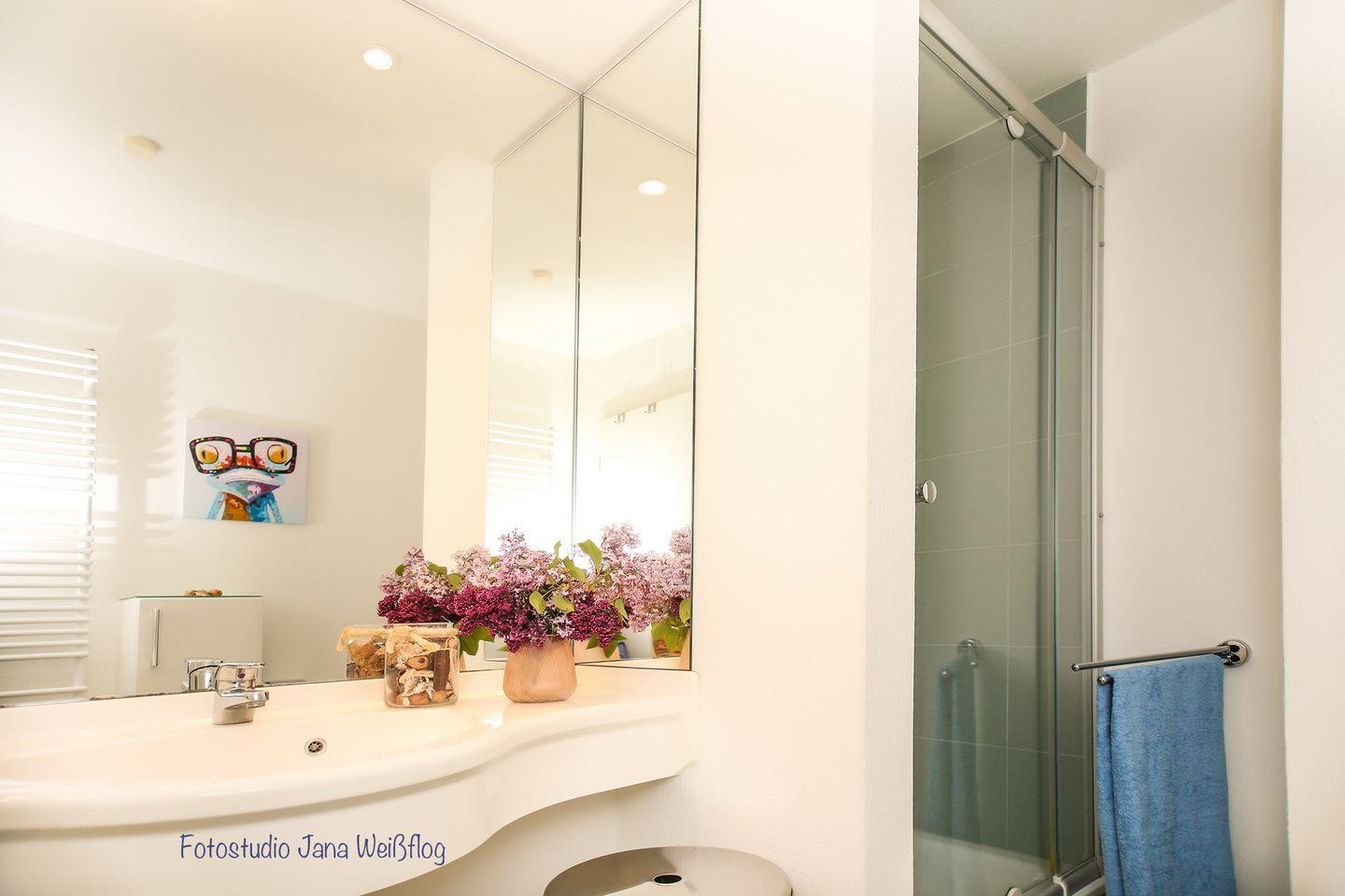 Das großzügige Duschbad bietet neben dem WC einen großzügigen Waschtisch mit viel Ablagemöglichkeit und dreiseitiger Spiegelfläche. Im gesamten Wohnbereich wurden Fliesen verlegt. Ausnahme sind die Schlafzimmer der Ferienwohnung. Hier findest du PVC in Holzdielenoptik vor.