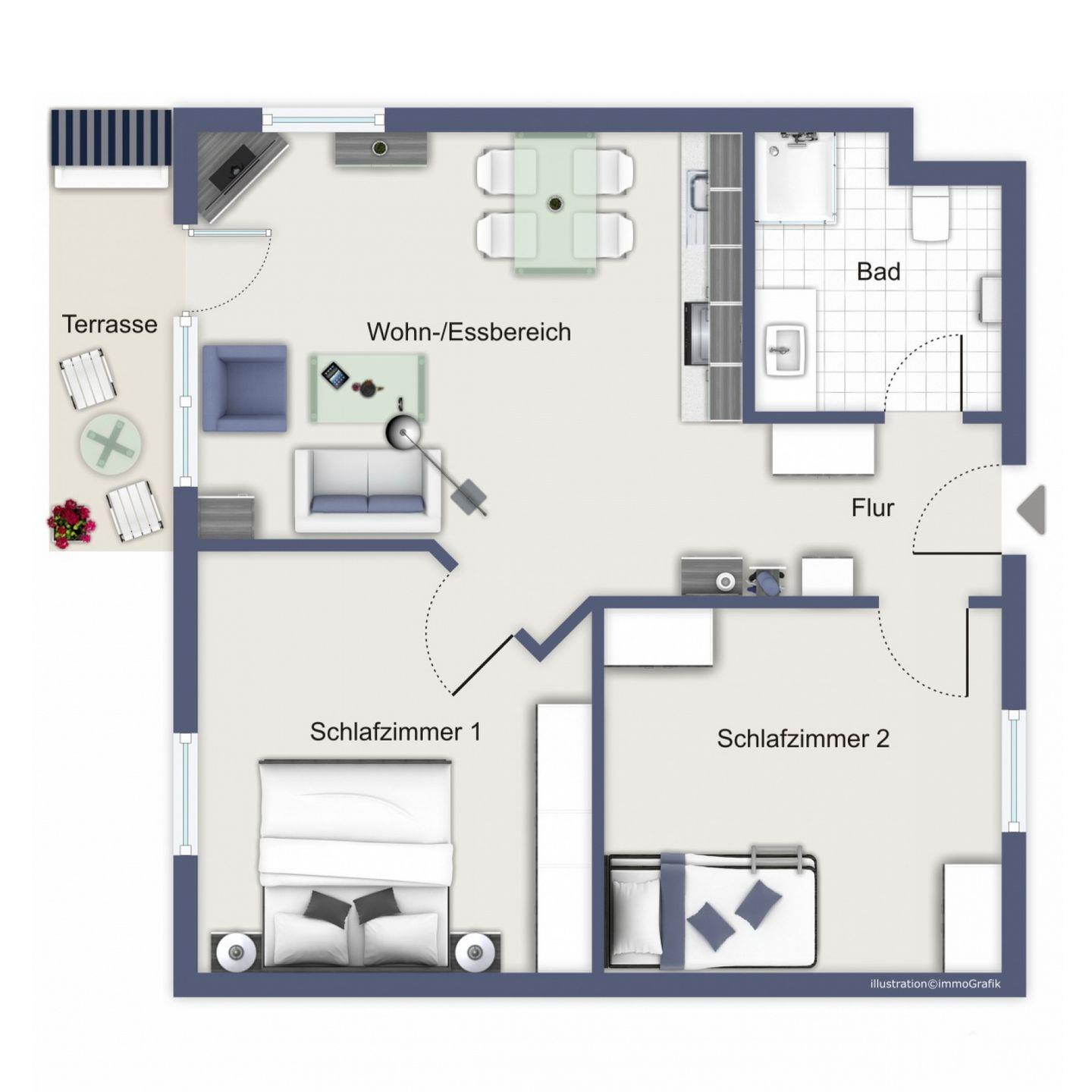 Der einladende Wohnbereich empfängt dich mit gemütlichen Sitzmöbeln. Zur Entspannung gibt es einen Flachbild-Fernseher. Durch die doppelflügelige Tür gelangst du von hier aus auf die überdachte Terrasse der Ferienwohnung. Des Weiteren steht dir kostenfreies WLAN zur Verfügung.