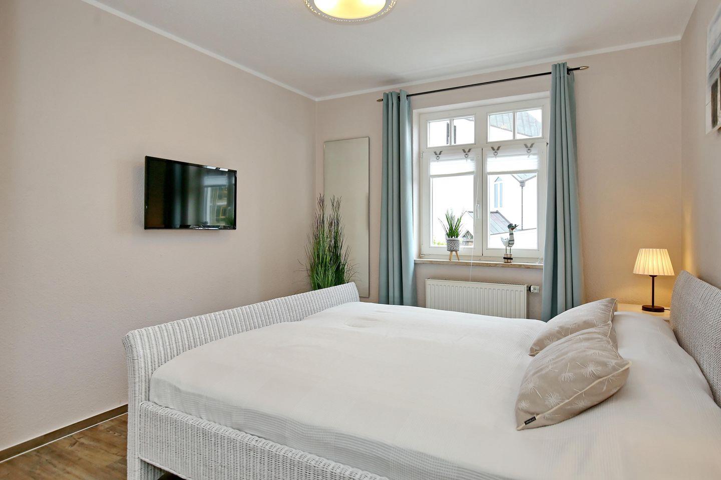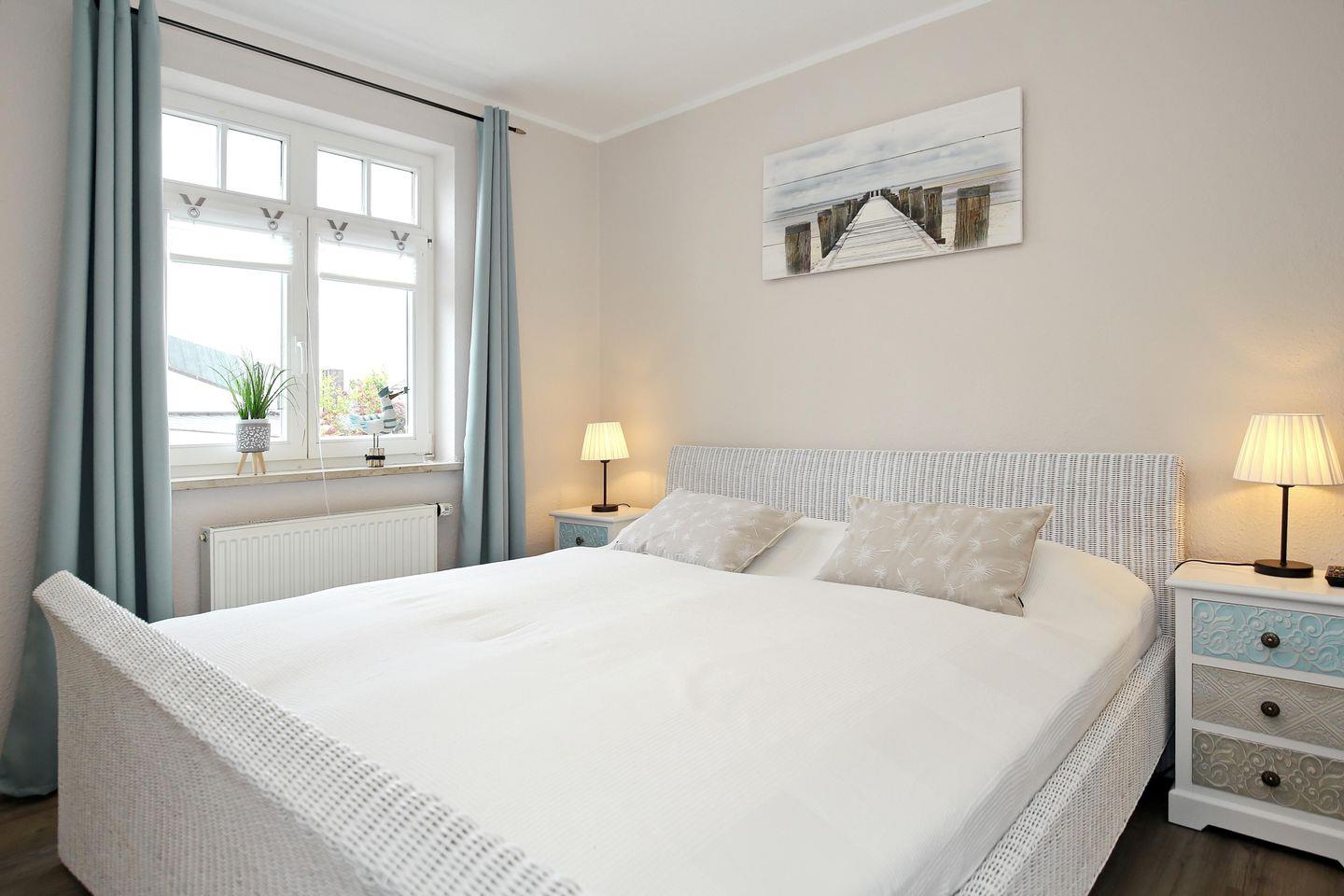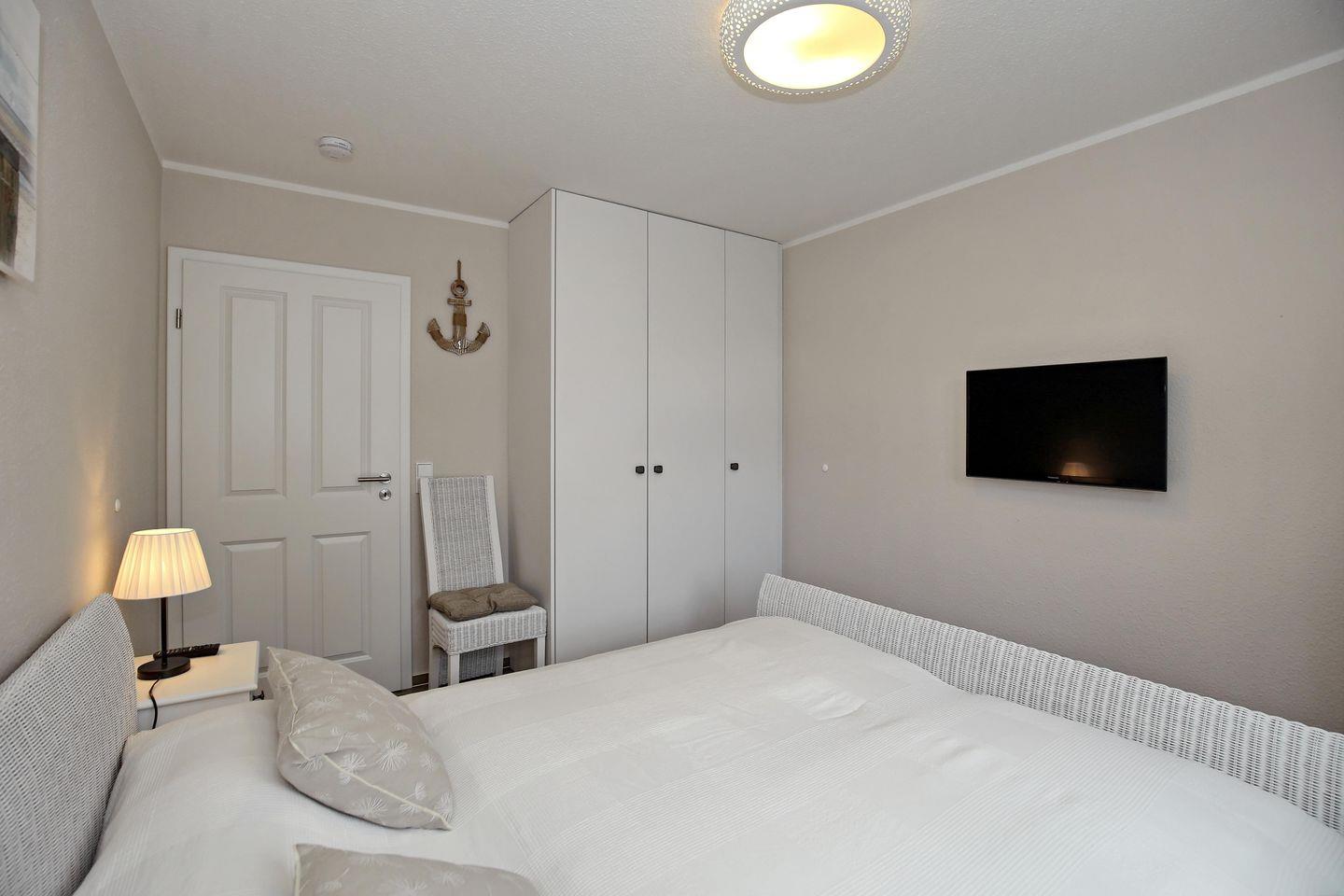 In den Schlafzimmern der Ferienwohnung lädt je ein gemütliches Doppelbett (2 x 90 cm x 200 cm) zum erholsamen Schlaf ein. In einem Schlafzimmer befindet sich ein Flachbild-TV. Ein Kleiderschrank und zwei Nachtschränke bieten dir viel Stauraum. Die Vorhänge an den Fenstern dienen dir zur Verdunklung.