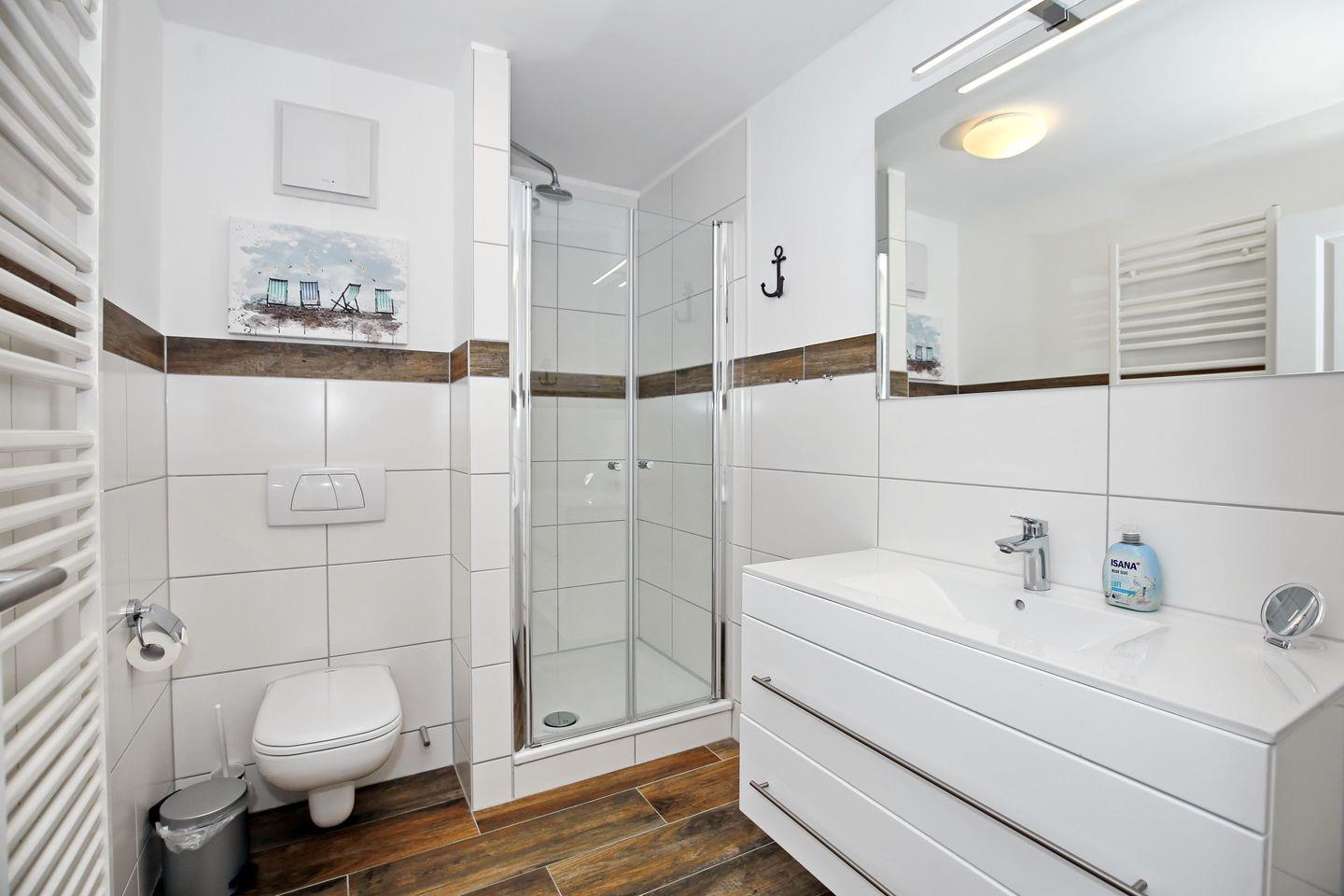 Die Ferienwohnung verfügt über ein gefliestes Duschbad mit WC und einem großen Waschbecken. Für deine Waschutensilien findest du unter dem Waschbecken genügend Ablagefläche. In dieser Nichtraucherwohnung sind Haustiere nicht erlaubt.