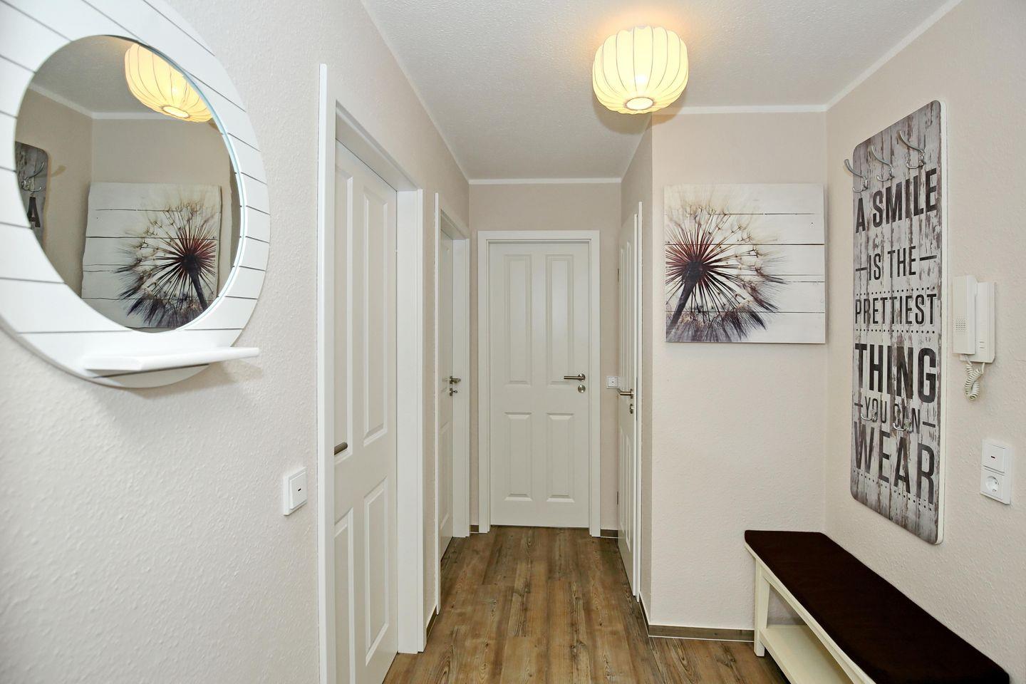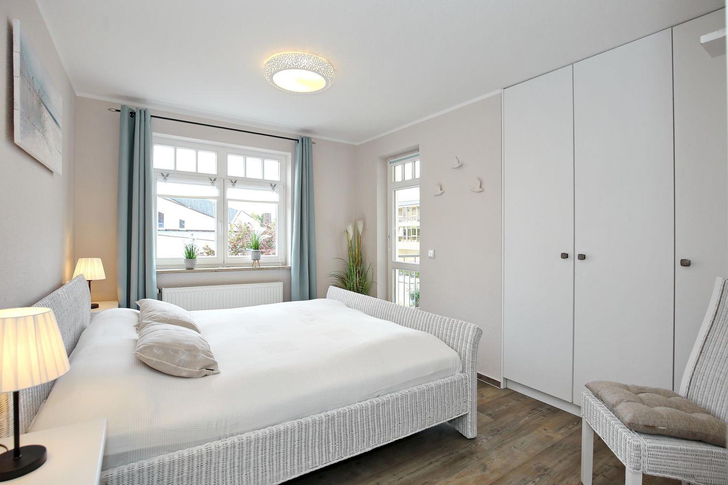 Deine Ferienwohnung befindet sich im 1. Obergeschoss, auf der Ostseite des Hauses und verfügt über zwei Balkone mit Teilseeblick. Mit einer Größe von 57 m² bietet die Wohnung mit einem geräumigen Wohn- und Essbereich, zwei komfortablen Schlafzimmern, einer funktionalen Küchenzeile und einem Duschbad viel Platz und lässt keine Wünsche offen. Die Entfernung zum Strand beträgt etwa 100 Meter.