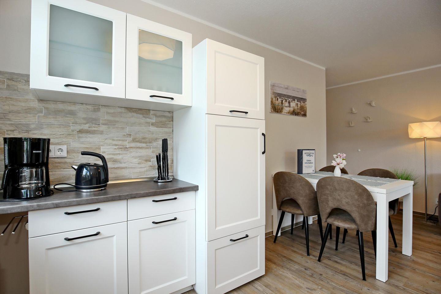 Die angrenzende offene Küchenzeile ist mit einem Kühlschrank mit Gefrierfach, einem Geschirrspüler, einem 4-Platten-Cerankochfeld, einer Mikrowelle und einem Backofen voll ausgestattet. Natürlich stehen dir ein Toaster, eine Kaffeemaschine und ein Wasserkocher zur Verfügung.