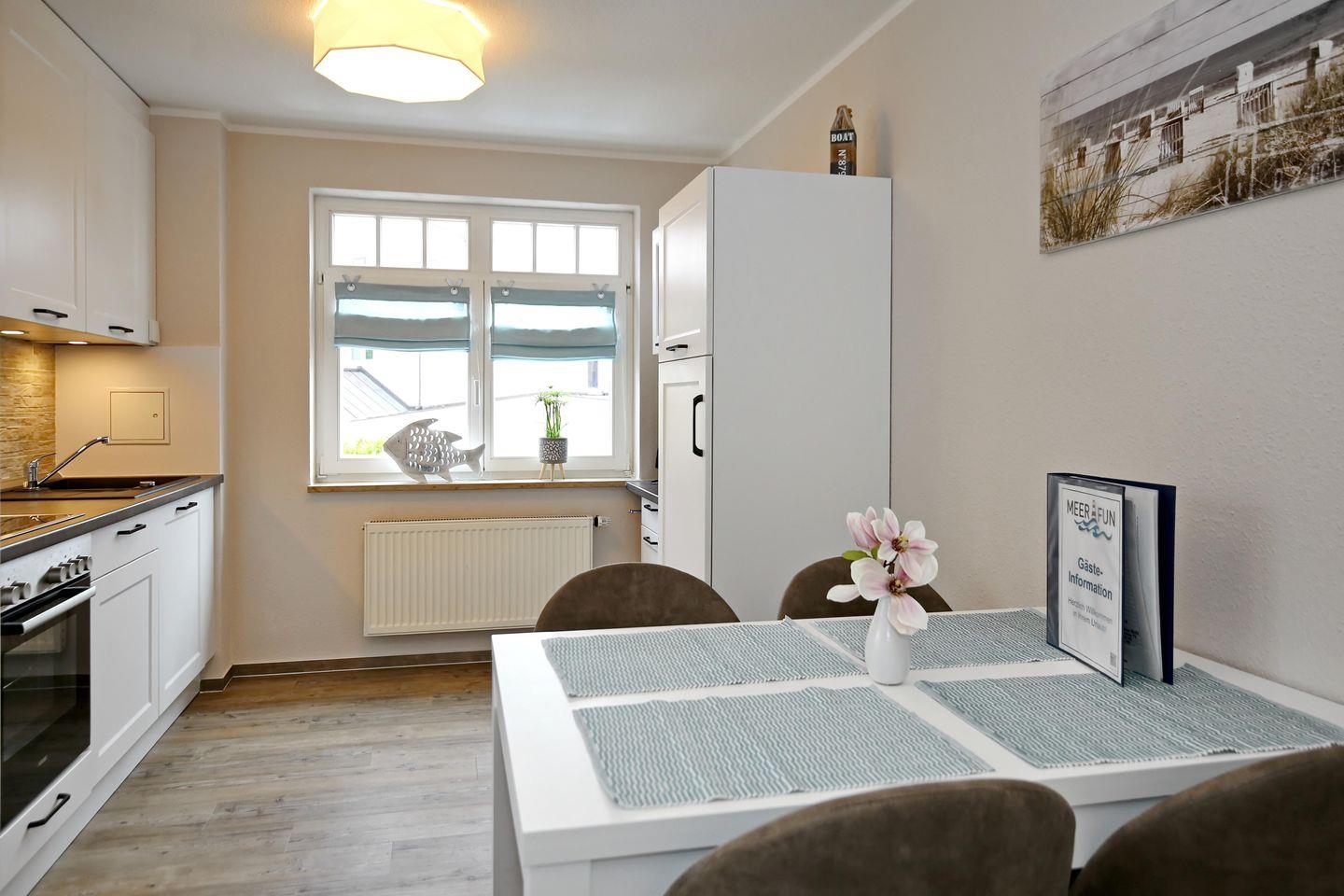 Der großzügige Wohnraum der Ferienwohnung lädt mit einer bequemen Couch zu geselligen Fernsehabenden mit einem modernen Flachbild-TV ein. Der große Esstisch, der sich zwischen dem Wohnbereich und der Küchenzeile befindet, bietet ausreichend Platz für 4 Personen.