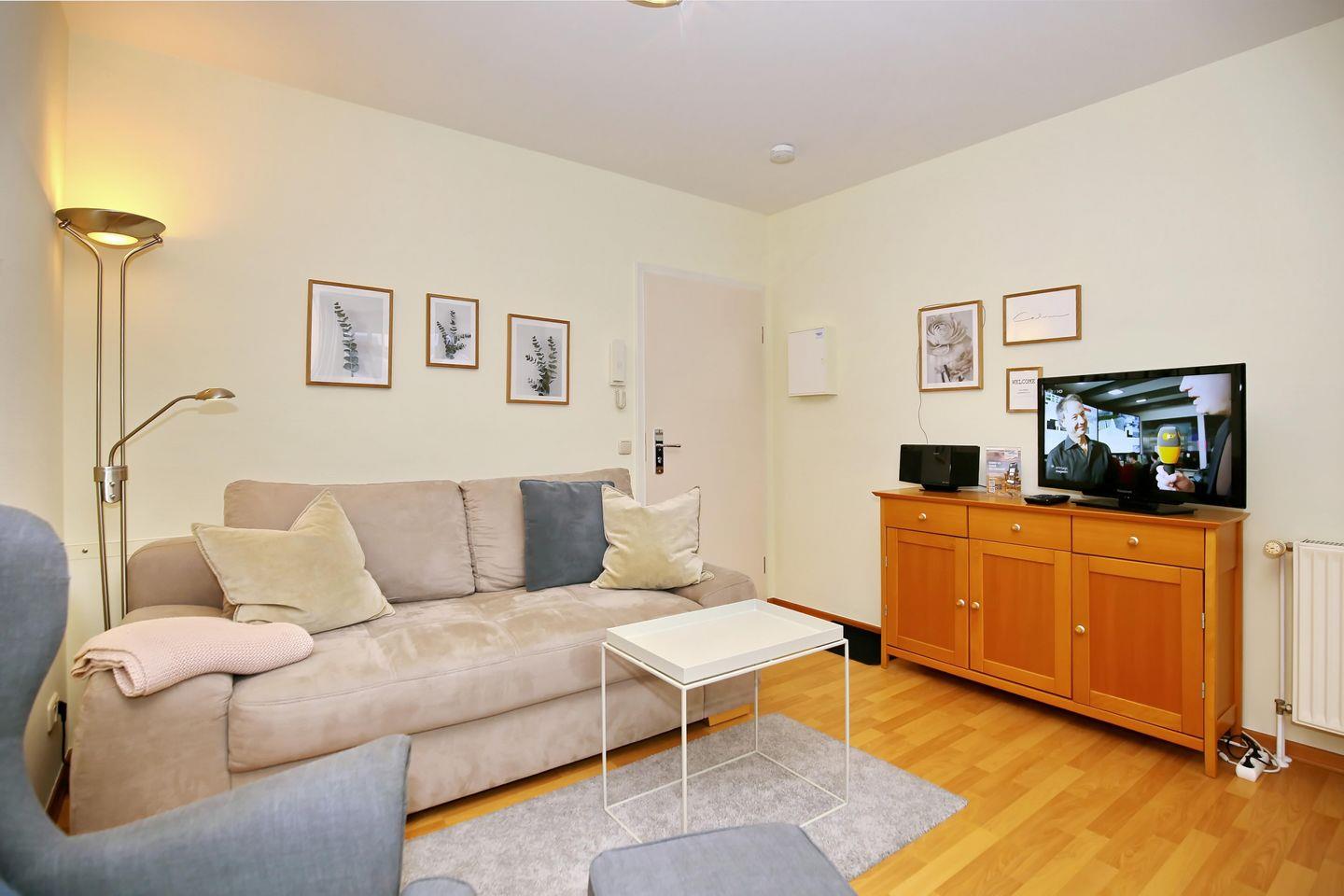 Der Wohnbereich ist für dich mit einer Doppelschlafcouch (160 x 200 cm), einem Couchtisch, einer Stereoanlage, einer Kommode und einem Flachbild-TV gemütlich eingerichtet. Von hier aus gelangst du auf den Balkon der Ferienwohnung. Der Essbereich bietet dir ausreichend Platz für gemeinsame Mahlzeiten.