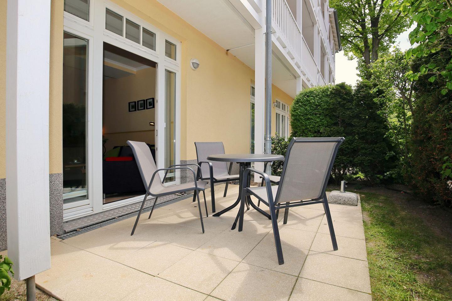 Verbringe in der 2-Zimmer-Wohnung mit bis zu 4 Personen erholsame Urlaubstage in Kühlungsborn. Auf 45 m² teilt sich die Erdgeschoss-Wohnung für dich in einen Wohn- und Essbereich, eine Küchenzeile, ein Schlafzimmer und ein Duschbad auf. Auf der möblierten Terrasse mit West-Ausrichtung kannst du die frische Ostseeluft genießen. Bis zum feinsandigen Strand und zur Strandpromenade gehst du nur 50 Meter.