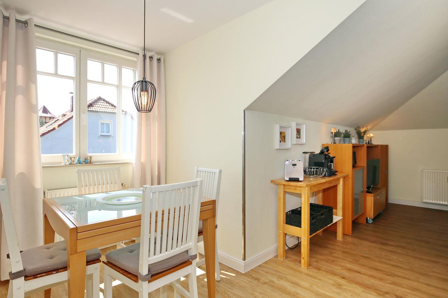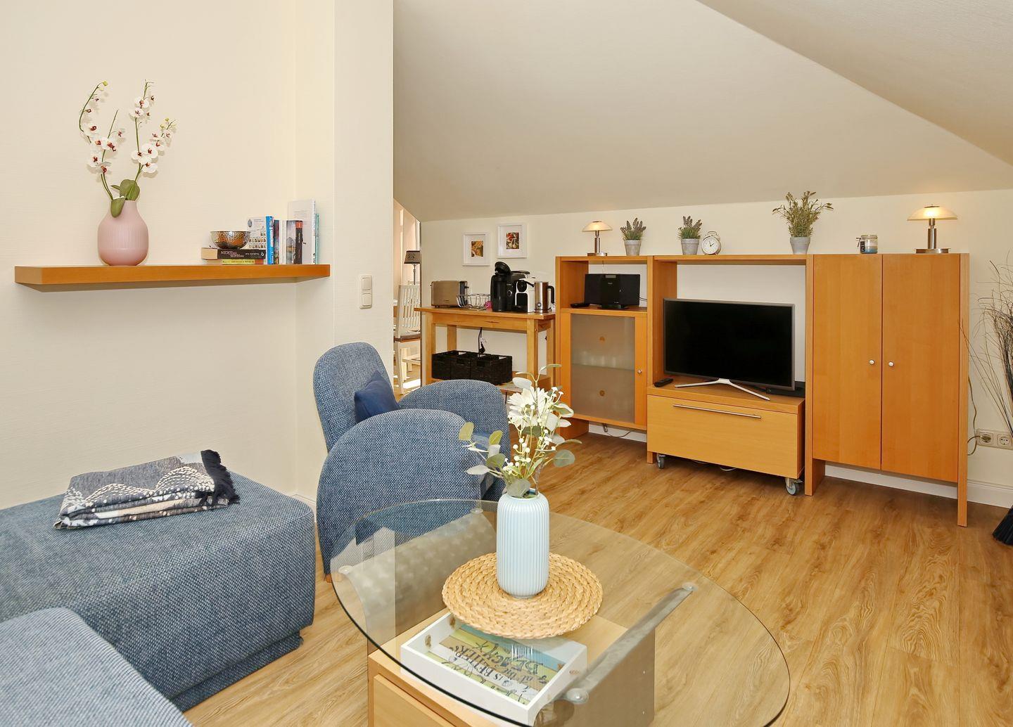 Der Wohnbereich ist für dich mit einer Couch, einem Couchtisch, einer Stereoanlage, einer Kommode und einem Flachbild-TV gemütlich eingerichtet. Von hier aus gelangst du auf den Balkon der Ferienwohnung. Der Essbereich bietet dir ausreichend Platz für gemeinsame Mahlzeiten.