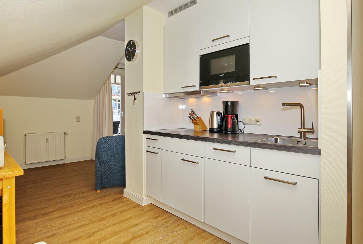 Die Küchenzeile der Ferienwohnung verfügt für dich über einen Wasserkocher, eine Kaffeemaschine, einen Kühlschrank mit Gefrierfach, einen Toaster sowie eine Mikrowelle. Eine Espresso-Kapsel-Maschine von Bosch und ein Milchaufschäumer komplettieren die Ausstattung. Zum Kochen ist ein 2-Platten-Induktions-Kochfeld vorhanden.