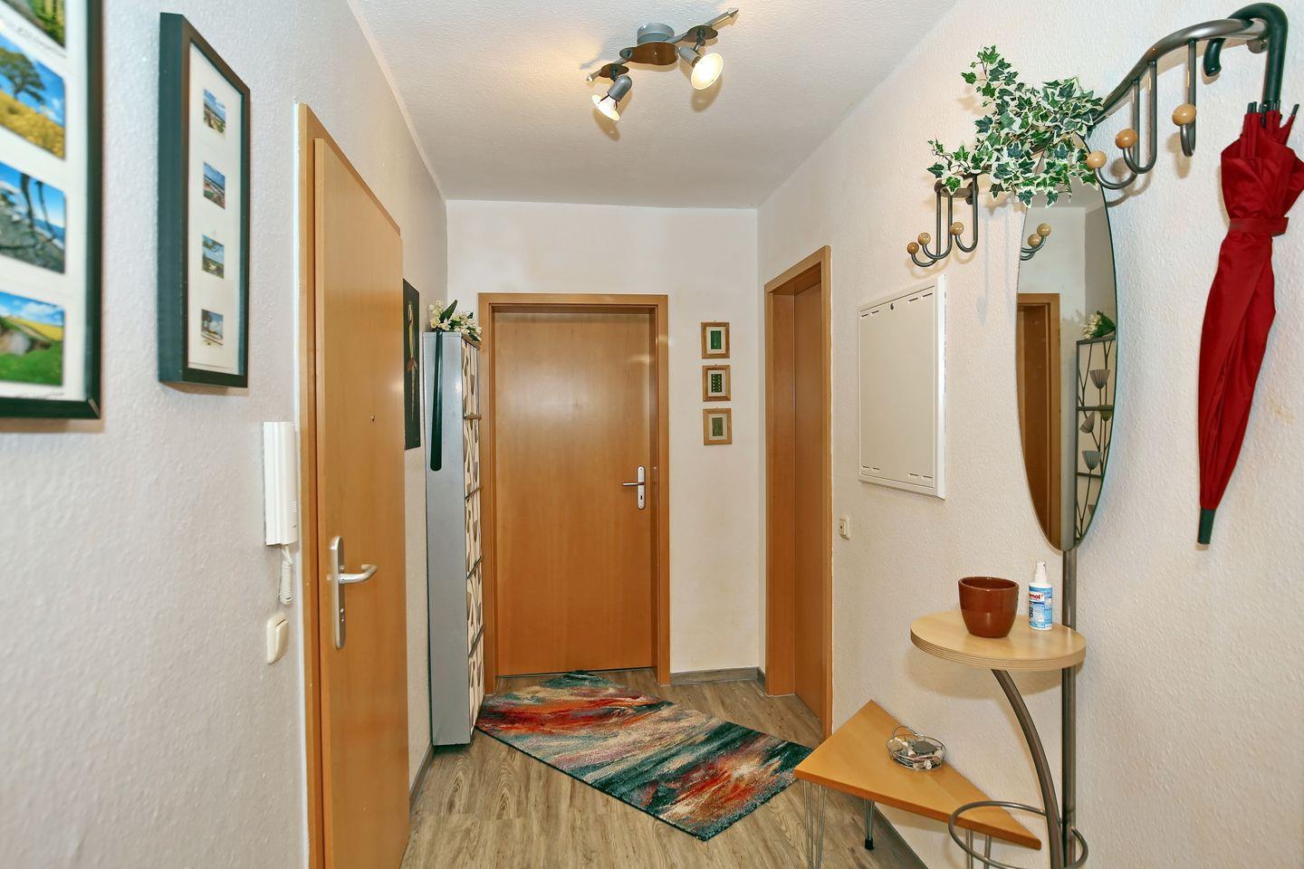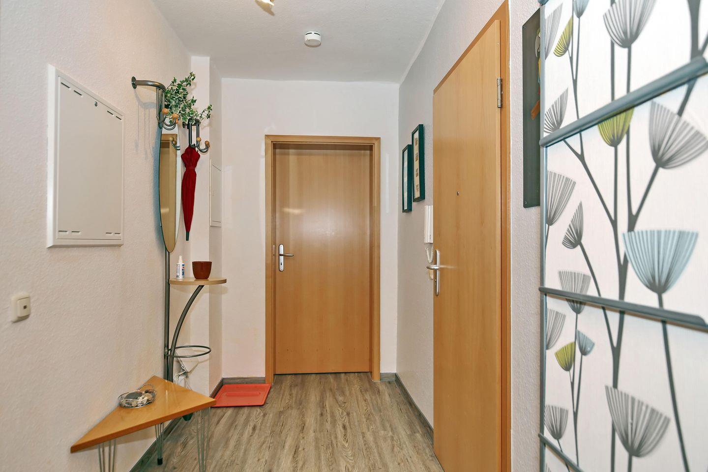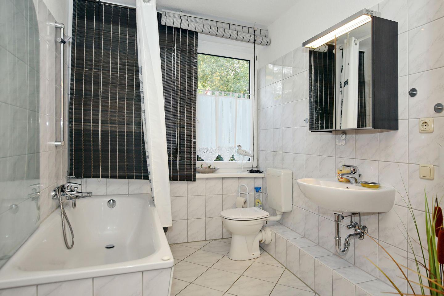 Das Tageslichtbad ist mit einer Badewanne und einem WC ausgestattet. Ebenso findest du einen Spiegel, ein Regal und einen Handtuchheizkörper vor. An den Fenstern sind Rollos als Sichtschutz angebracht. Das Bad und der Küchenbereich sind gefliest. Im Wohnbereich und im Flur wurde Vinyl und im Schlafzimmer Teppich verlegt.