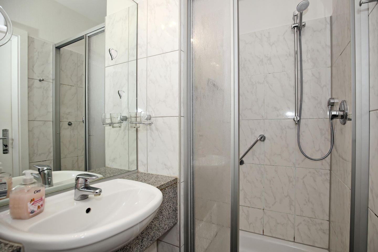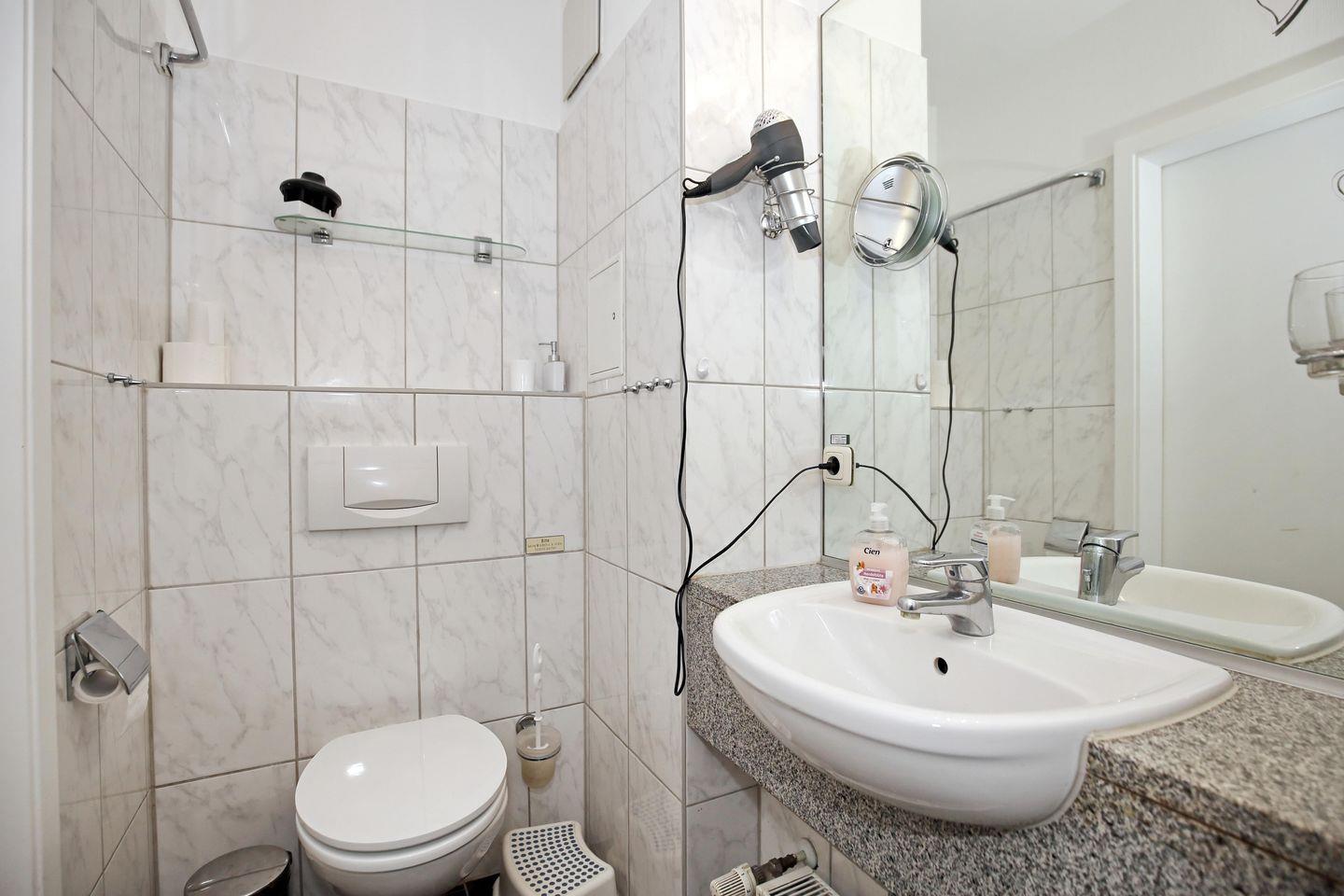 Die Ferienwohnung verfügt über ein gefliestes Duschbad mit WC sowie einen Föhn und einen Kosmetikspiegel. Im Wohn- und Essbereich und im Schlafzimmer ist Vinyl verlegt.
