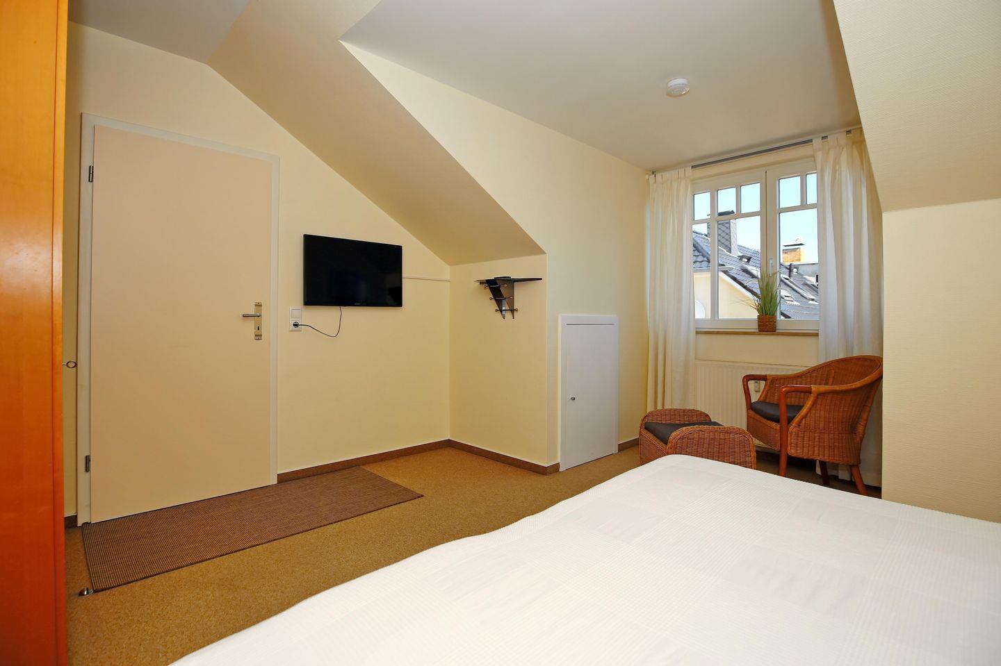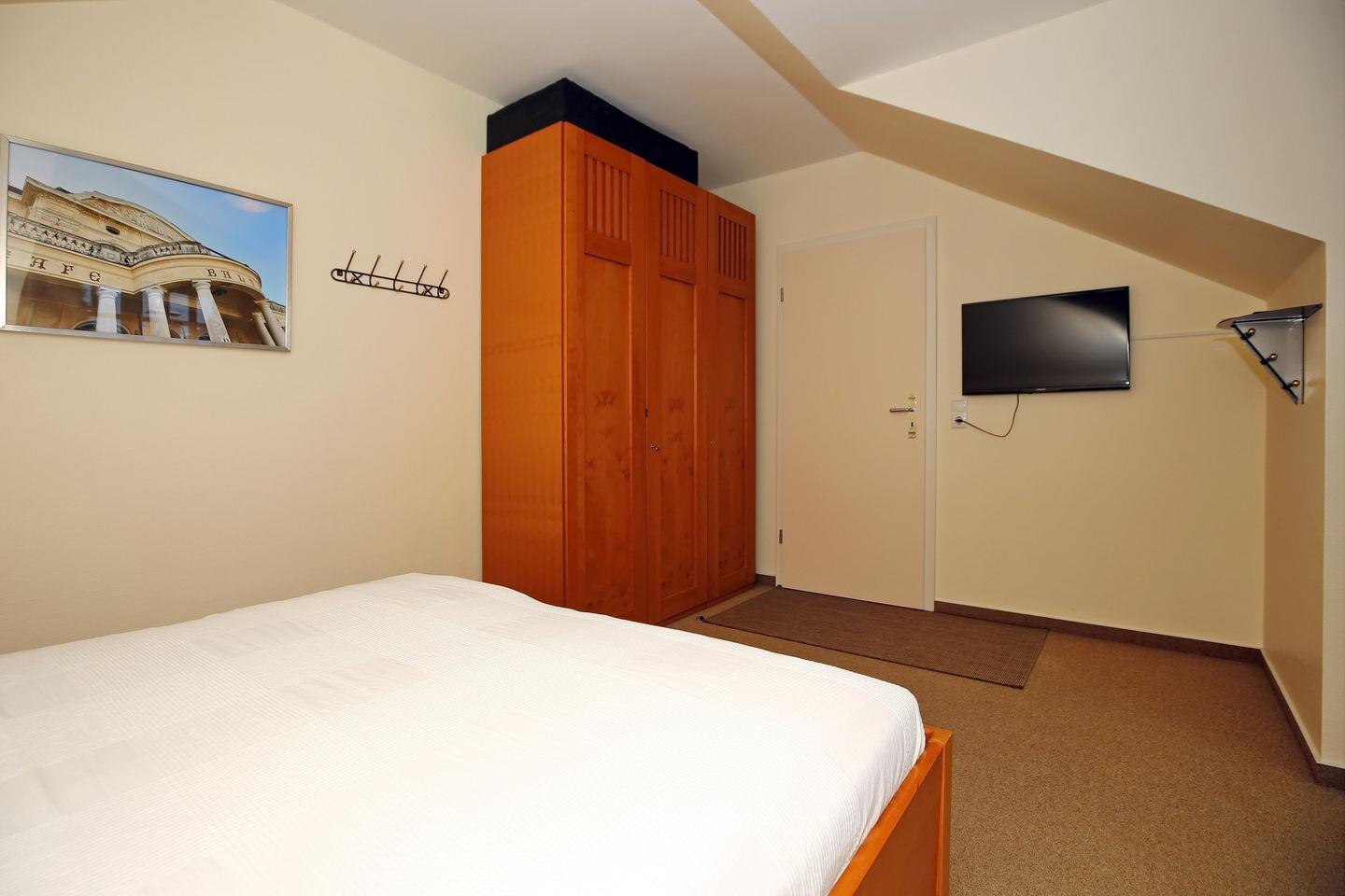 Das Schlafzimmer lädt dich mit einem bequemen Doppelbett (2 x 80 x 200 cm) zur erholsamen Nachtruhe ein. Zur medialen Unterhaltung bietet sich der vorhandene Flachbild-TV an. Ein Kleiderschrank bietet dir hier Stauraum für dein Urlaubsgepäck. Die Schlafcouch (150 x 200 cm) im Wohnbereich der Ferienwohnung wird schnell zu einem bequemen Schlafplatz für eine weitere Person.