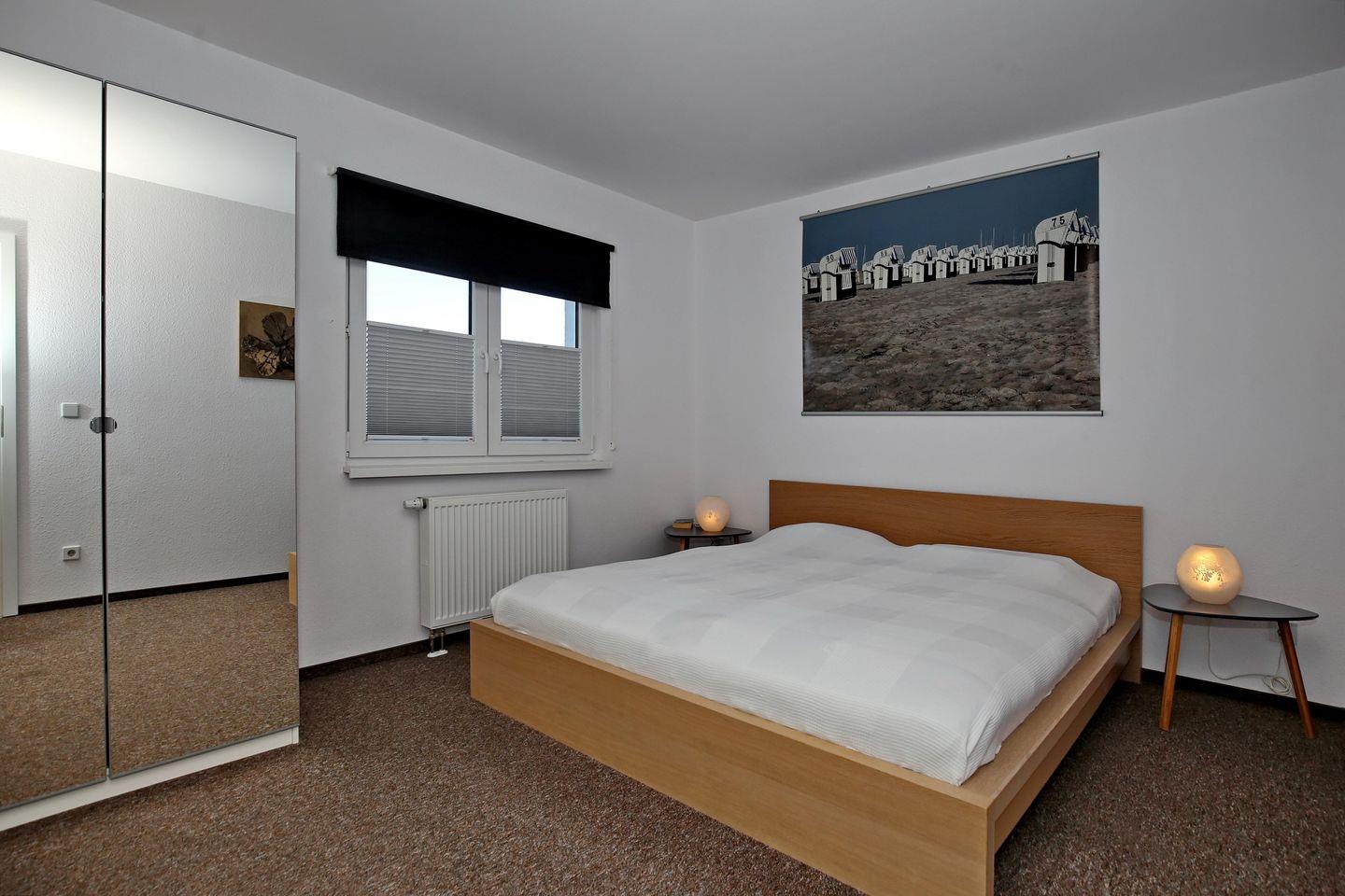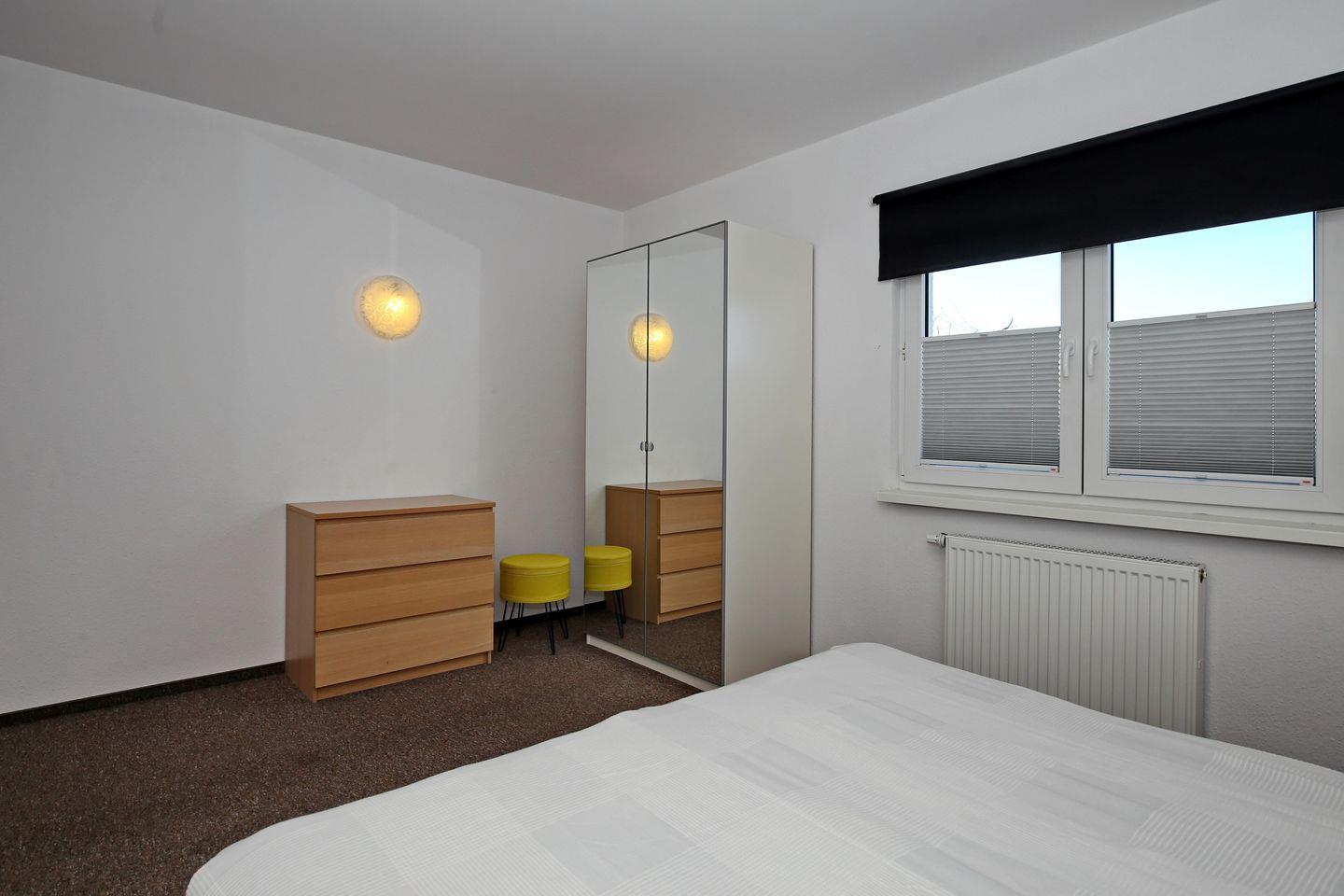In dem Schlafzimmer der Ferienwohnung lädt ein gemütliches Doppelbett (2 x 90 x 200 cm) zum erholsamen Schlaf ein. Ein Kleiderschrank sowie zwei Nachtschränke bieten dir genügend Stauraum für deine Urlaubsgarderobe. Ein Rollo an den Fenstern dient dir zur Verdunklung.