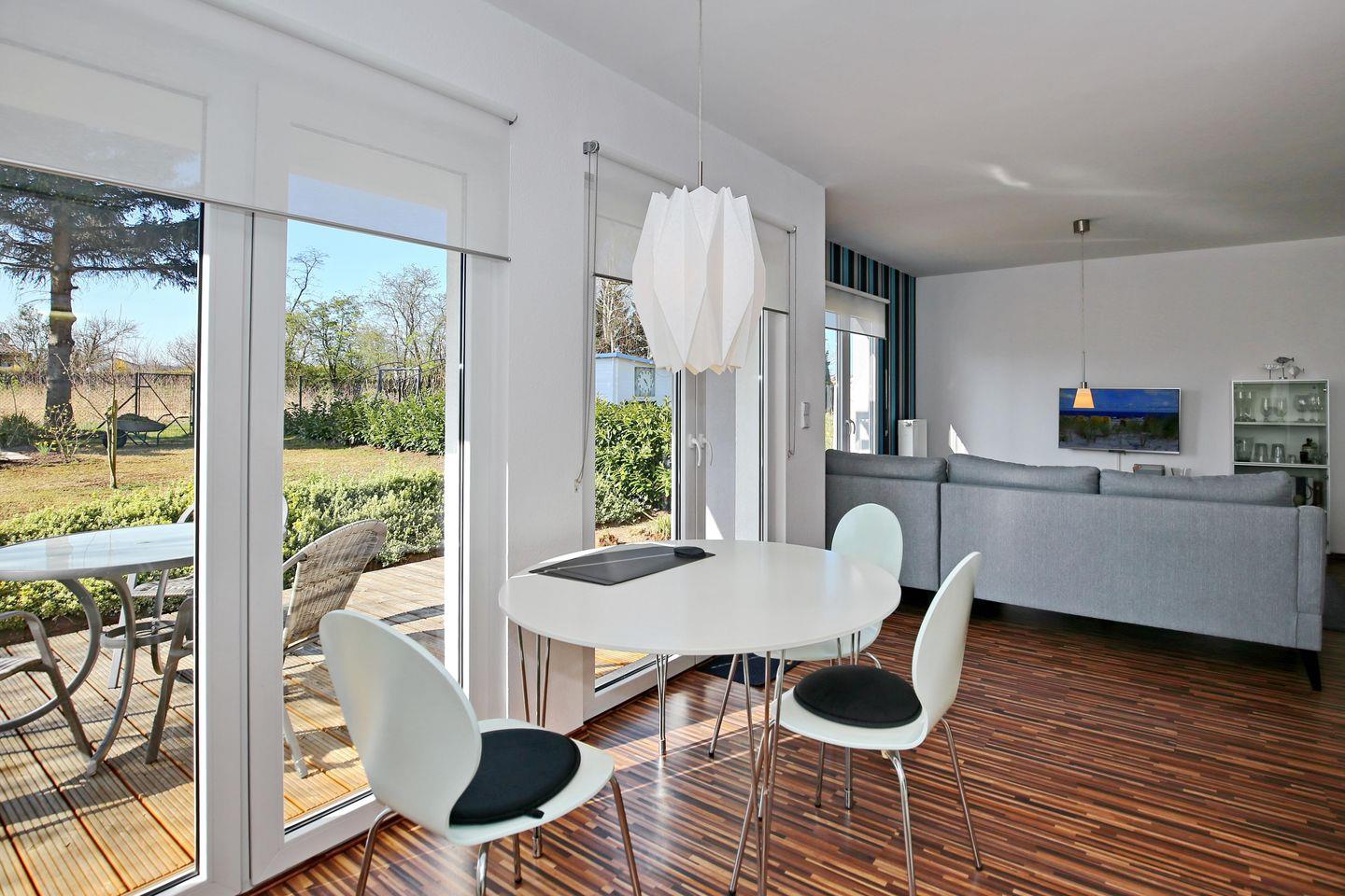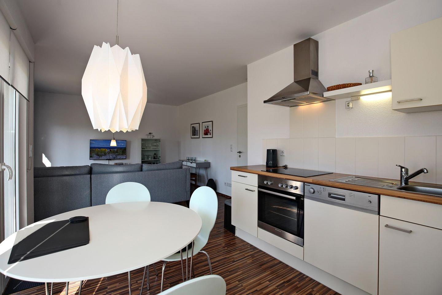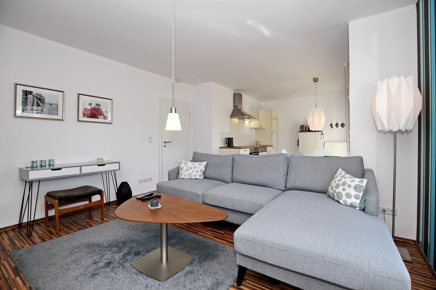 Im Wohnraum der Ferienwohnung warten auf dich eine gemütliche Couch, sowie ein moderner Flachbild-TV. Am Esstisch hast du genügend Platz für gemeinsame Mahlzeiten.