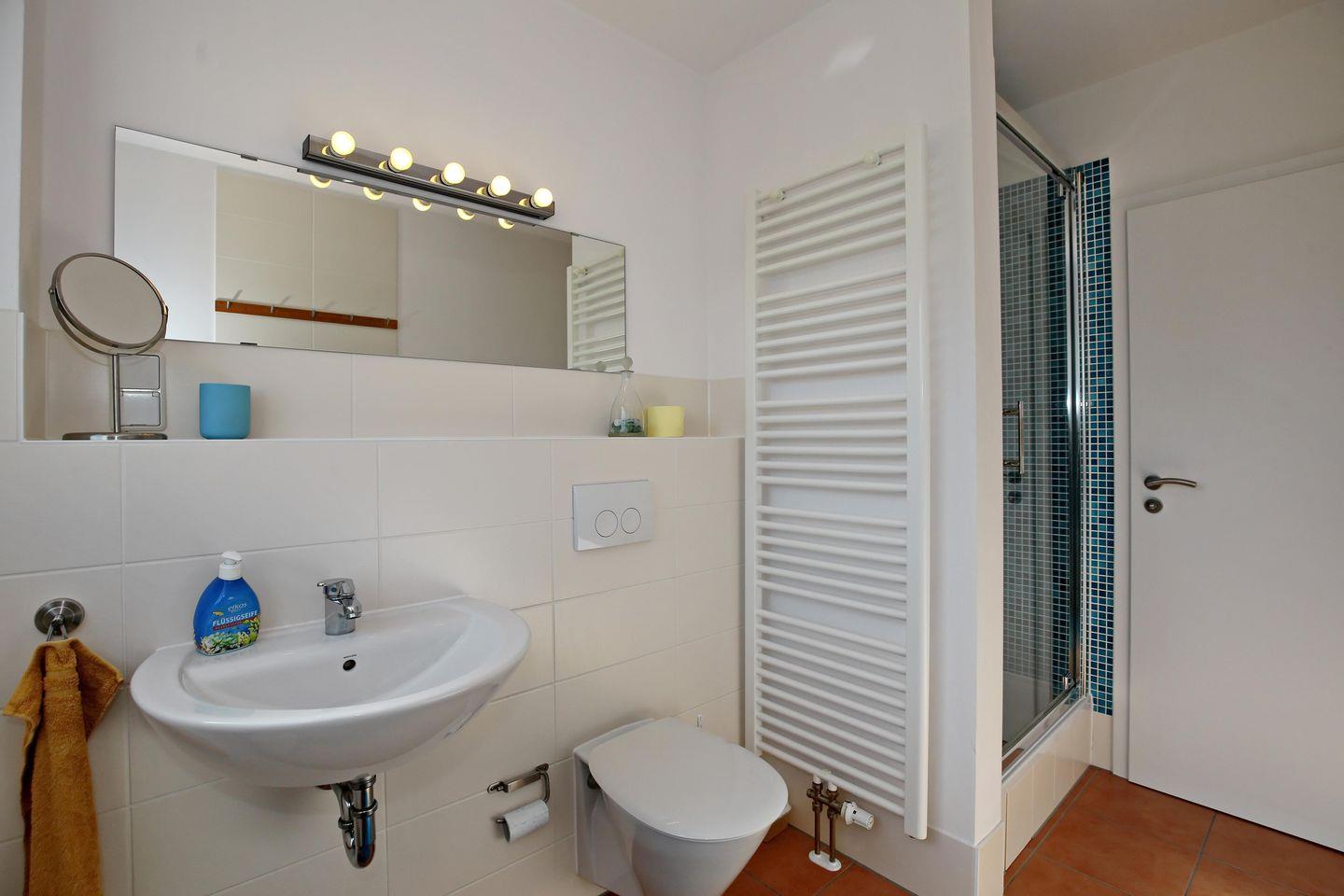 Die Ferienwohnung verfügt über ein gefliestes Duschbad mit WC. Im Wohn- / Essbereich wurde Laminat verlegt und im Schlafzimmer befindet sich Teppich.