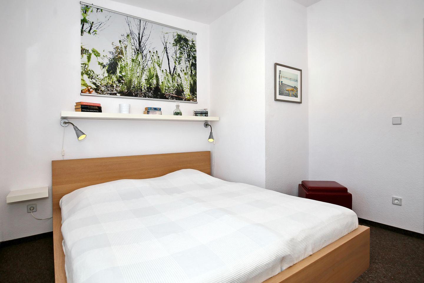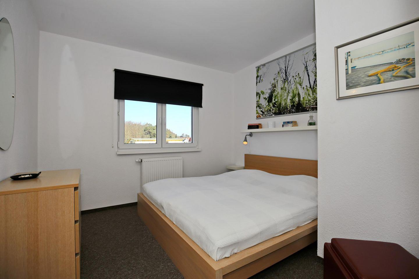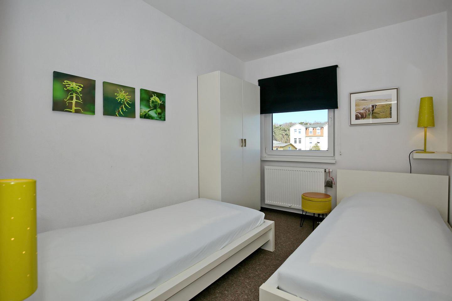 In dem ersten Schlafzimmer der Ferienwohnung lädt ein gemütliches Doppelbett zum erholsamen Schlaf ein. Im zweiten Schlafzimmer erwarten dich 2 Einzelbetten. Ein Kleiderschrank sowie zwei Nachtschränke bieten dir genügend Stauraum für deine Urlaubsgarderobe. Rollos an den Fenstern dienen dir zur Verdunklung.
