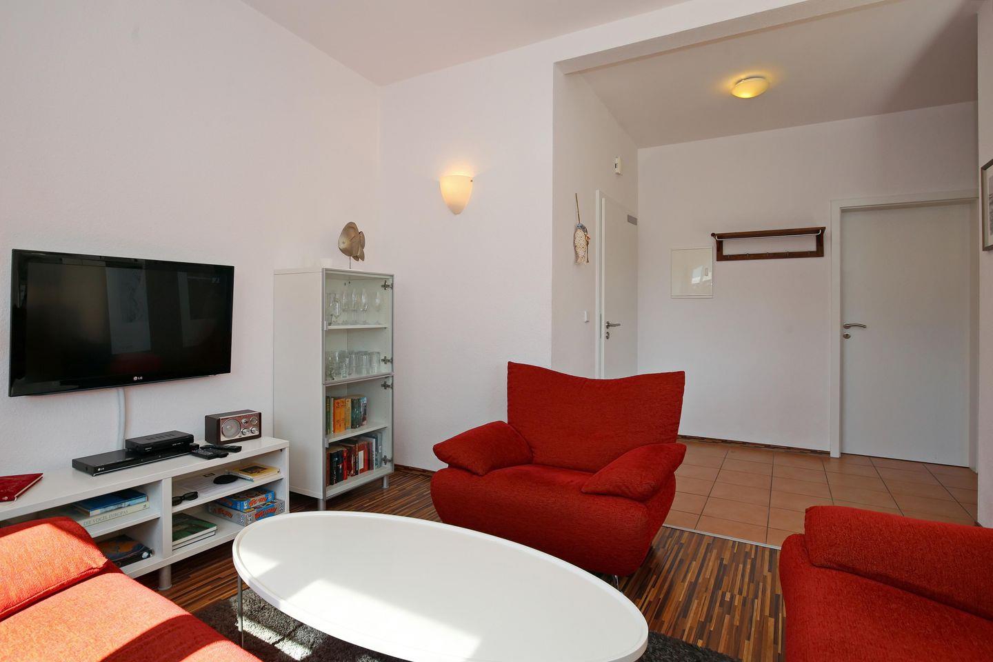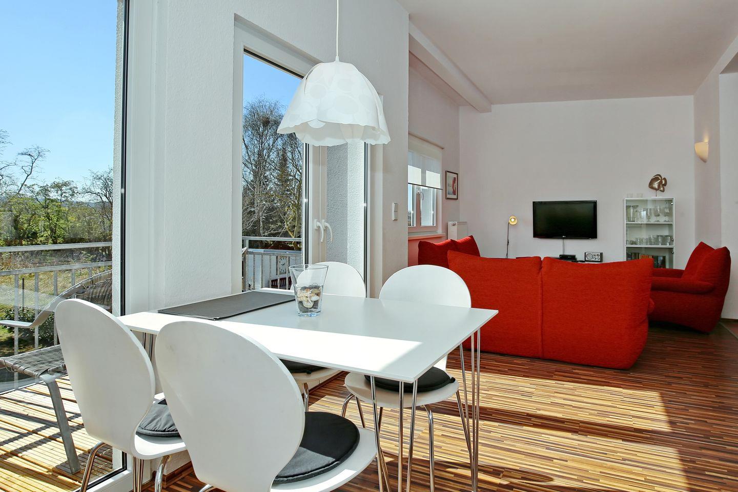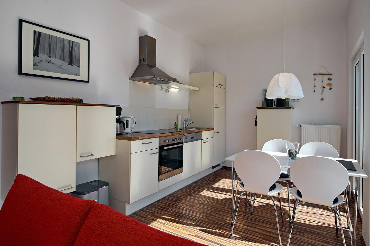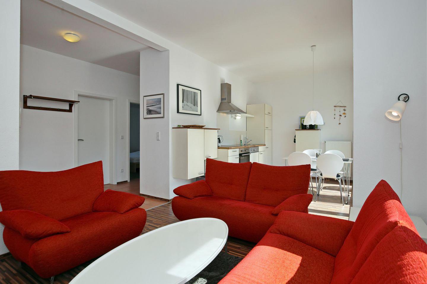 Im Wohnraum der Ferienwohnung warten auf dich zwei Sofas und ein Sessel, sowie ein moderner Flachbild-TV. Am Esstisch habt ihr genügend Platz für gemeinsame Mahlzeiten.