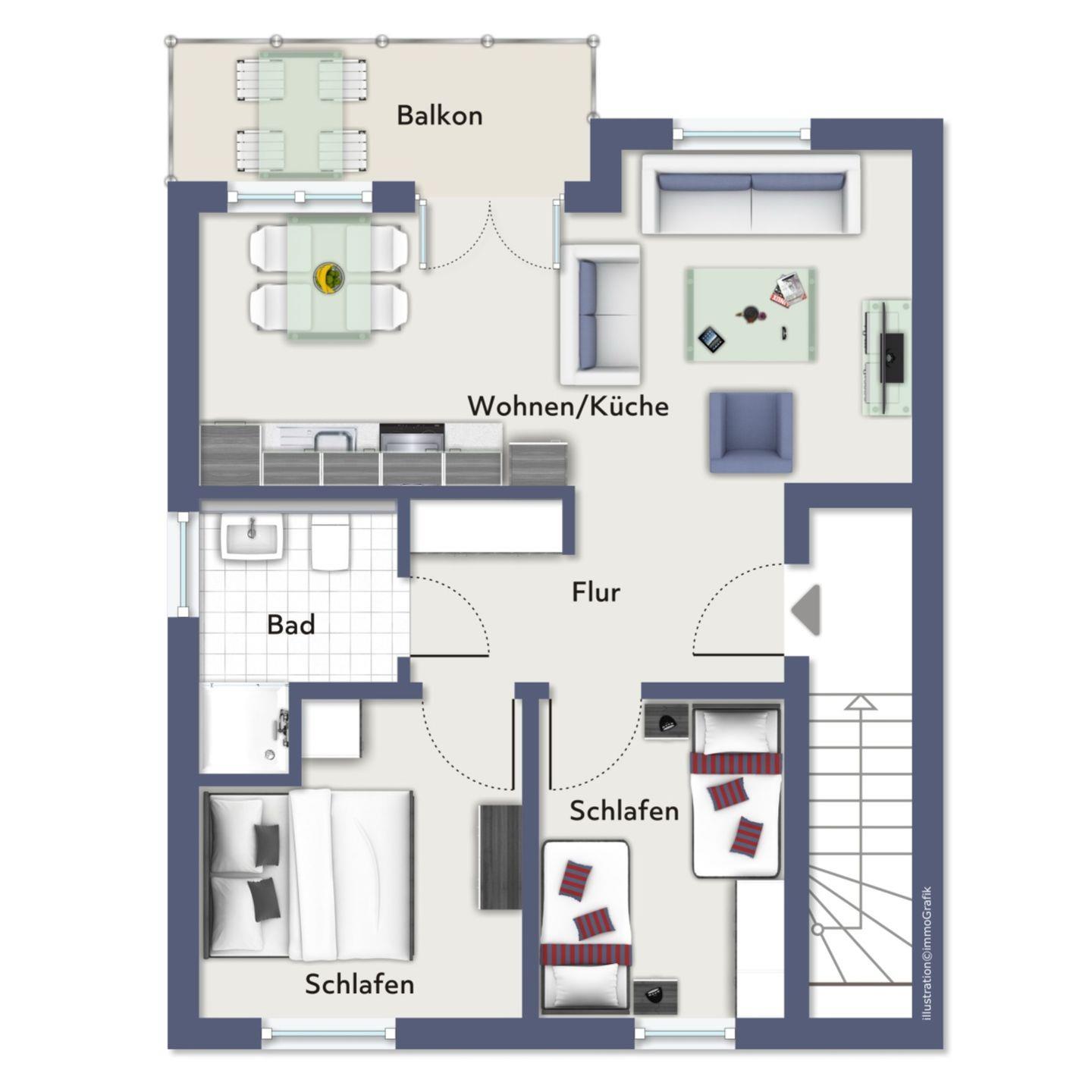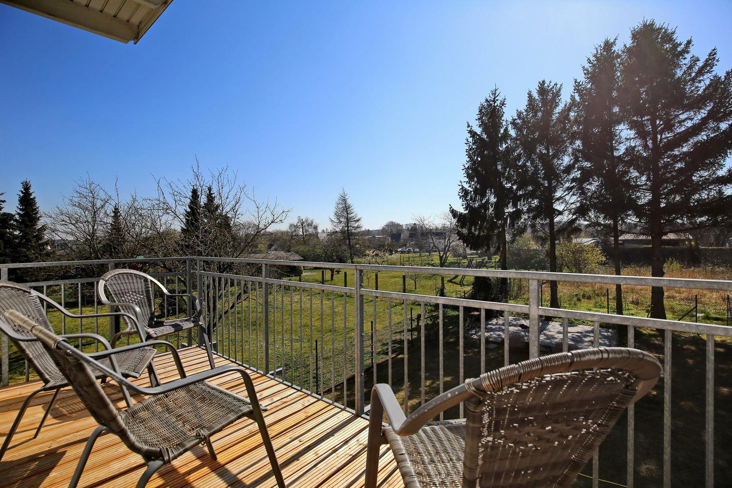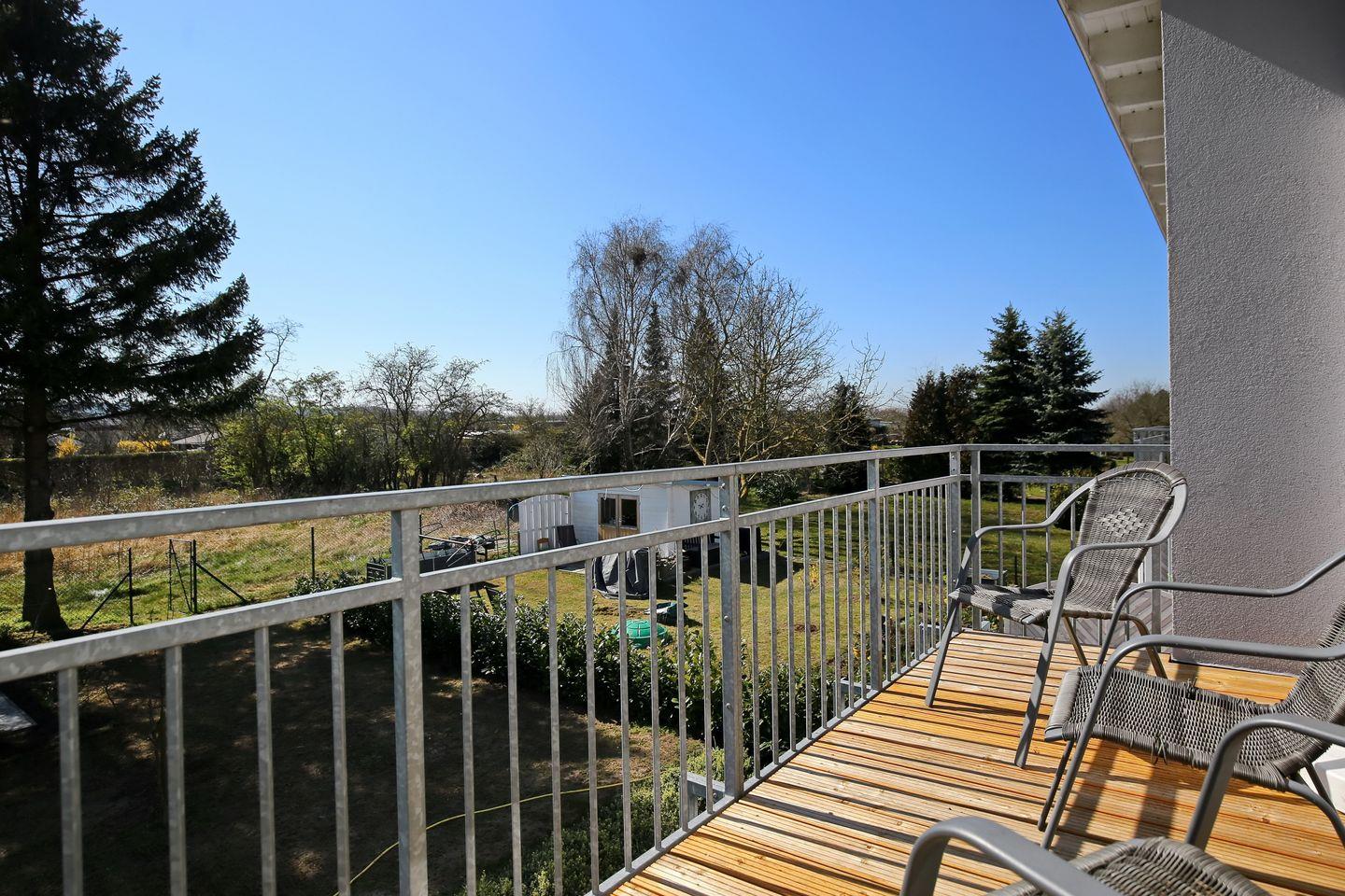 Die offene Küchenzeile ist mit einem Kühlschrank mit Gefrierfach, einem Geschirrspüler, einem 4 Platten Cerankochfeld, einem Backofen ausgestattet. Natürlich stehen dir ein Toaster, ein Wasserkocher und eine Kaffeemaschine zur Verfügung. Von hieraus kommst du auf den möblierten Südbalkon mit Blick in den Garten.