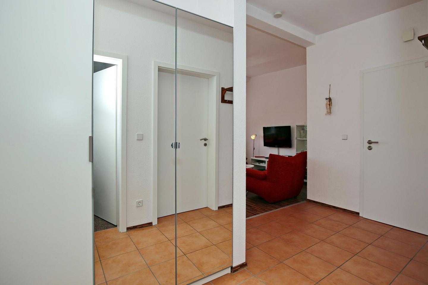 Die Ferienwohnung verfügt über ein gefliestes Duschbad mit WC. Im Wohn- / Essbereich wurde Laminat verlegt und im Schlafzimmer befindet sich Teppich.