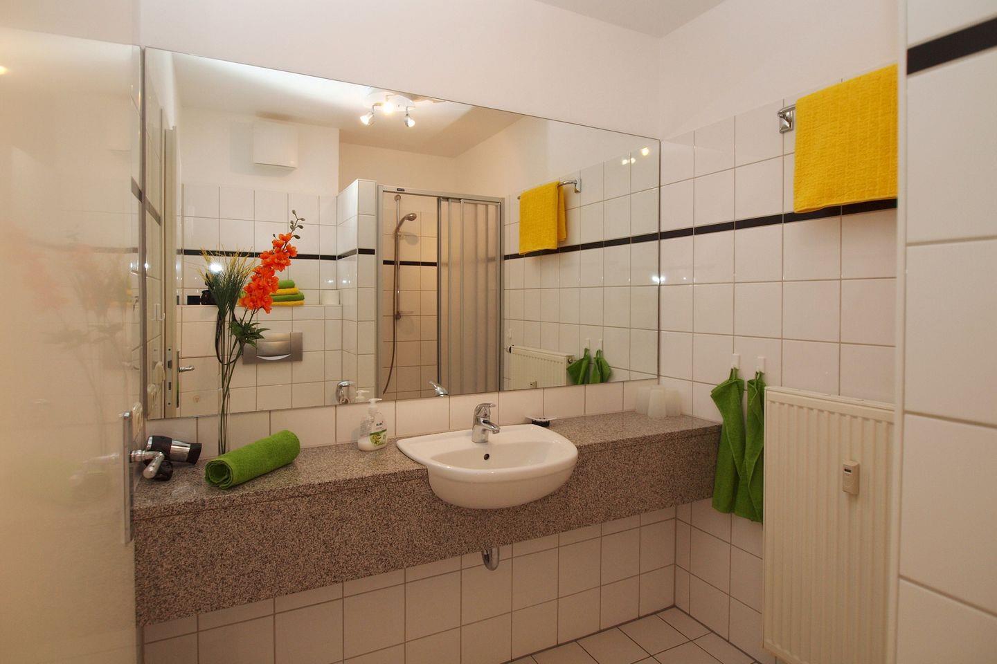 Die Ferienwohnung verfügt über ein gefliestes Duschbad mit WC und Föhn. In der restlichen Ferienwohnung wurde ein Vinylboden verlegt.