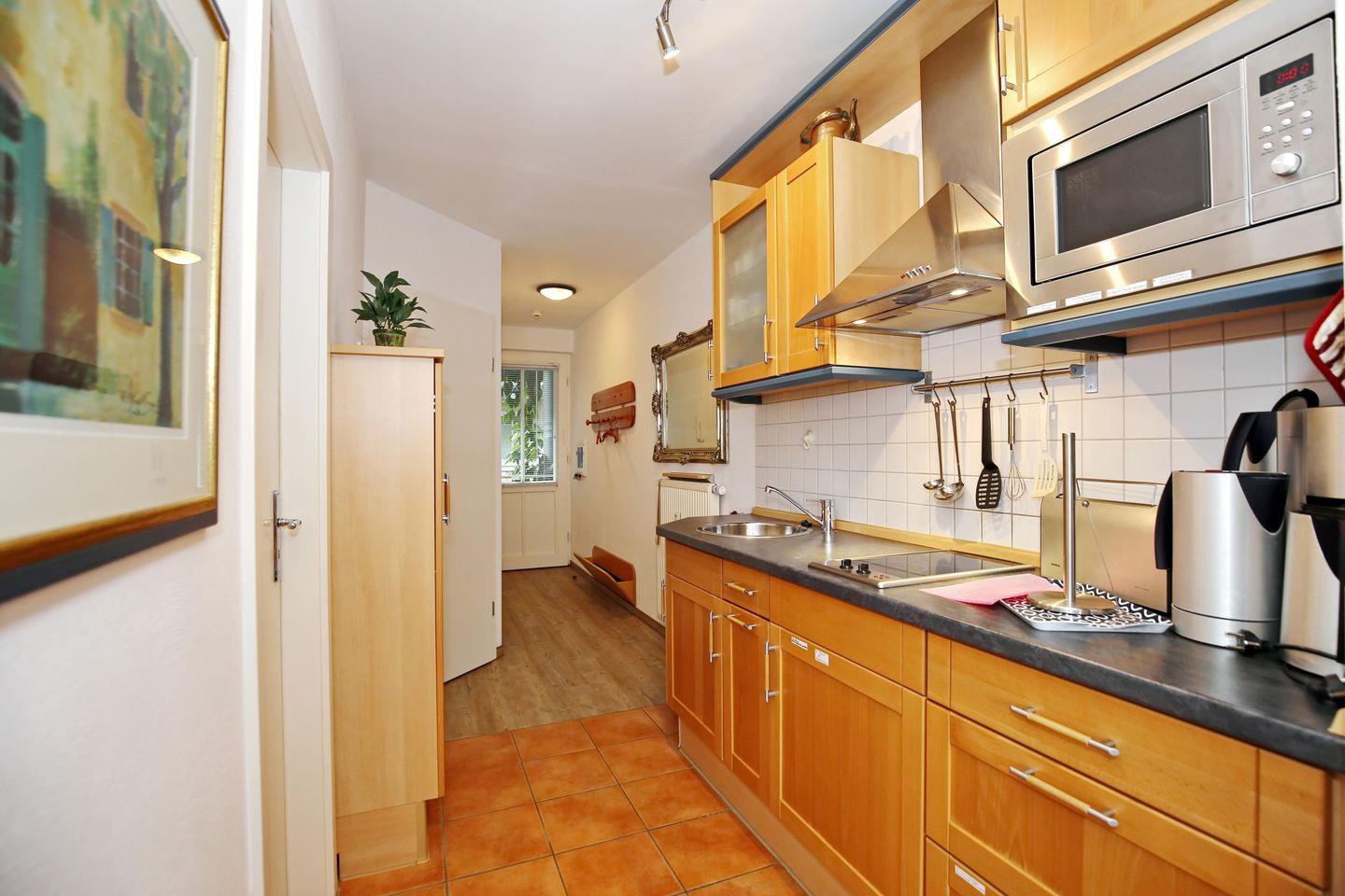 Die angrenzende Küchenzeile ist mit einem Kühlschrank mit Gefrierfach, einer Mikrowelle und 2-Platten-Cerankochfeldern gut ausgestattet. Natürlich stehen dir ein Toaster, eine Kaffeemaschine und ein Wasserkocher zur Verfügung.