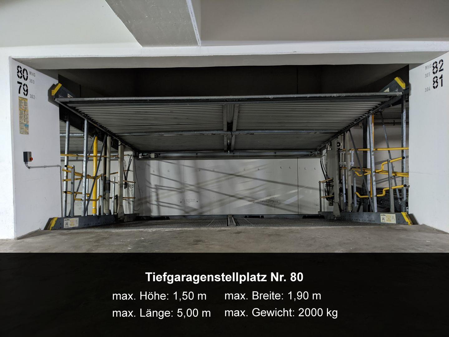 Zur Ferienwohnung gehört der Kfz-Stellplatz Nr. 80 in der Tiefgarage (max. Höhe 1,50 m, max. Gewicht 2.000 kg).