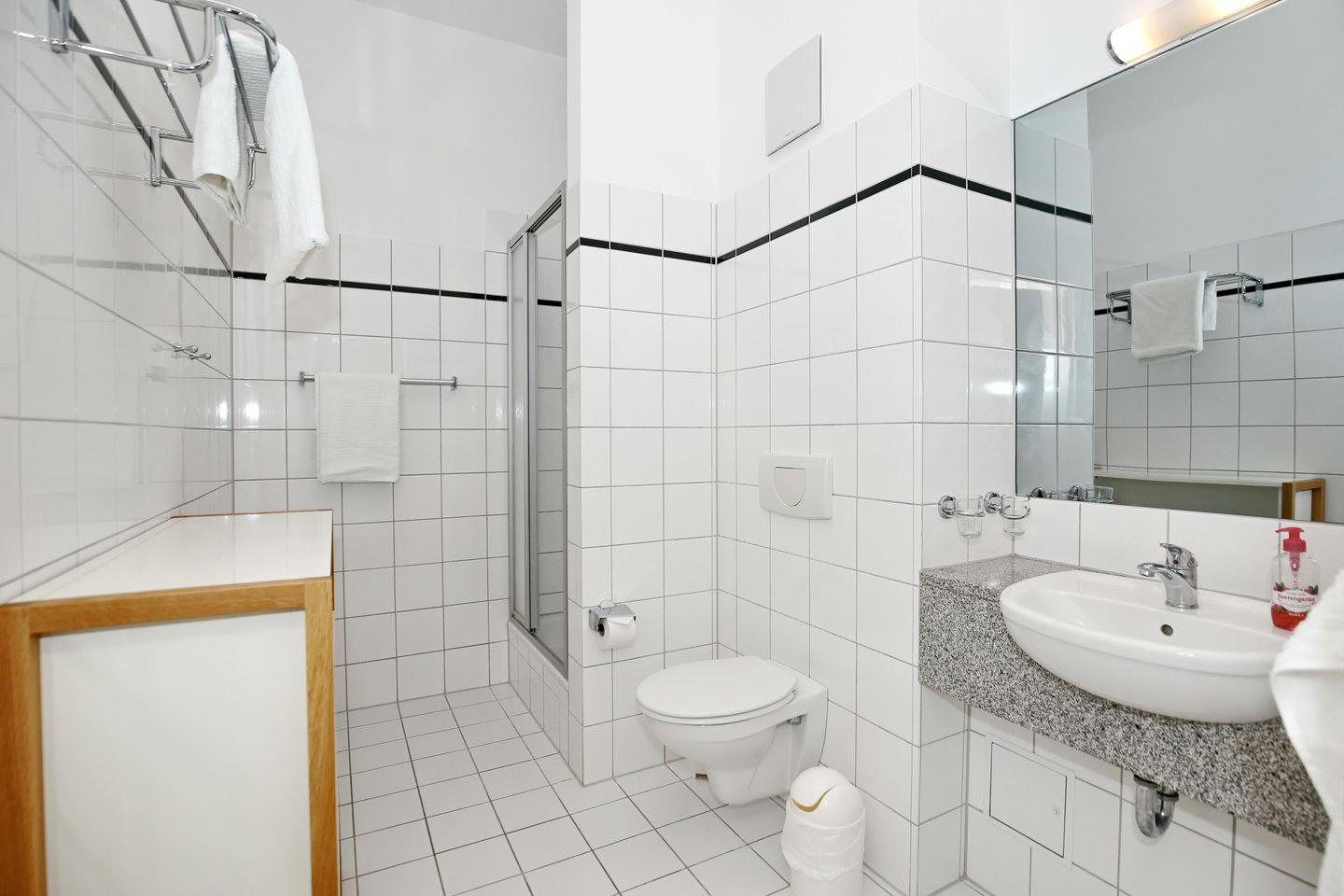 Die Ferienwohnung verfügt selbstverständlich auch über ein Duschbad mit WC, Föhn, Waschtisch und Spiegel. Als Bodenbelag wurde in der Wohnung Laminat verwendet, das Bad wurde gefliest.