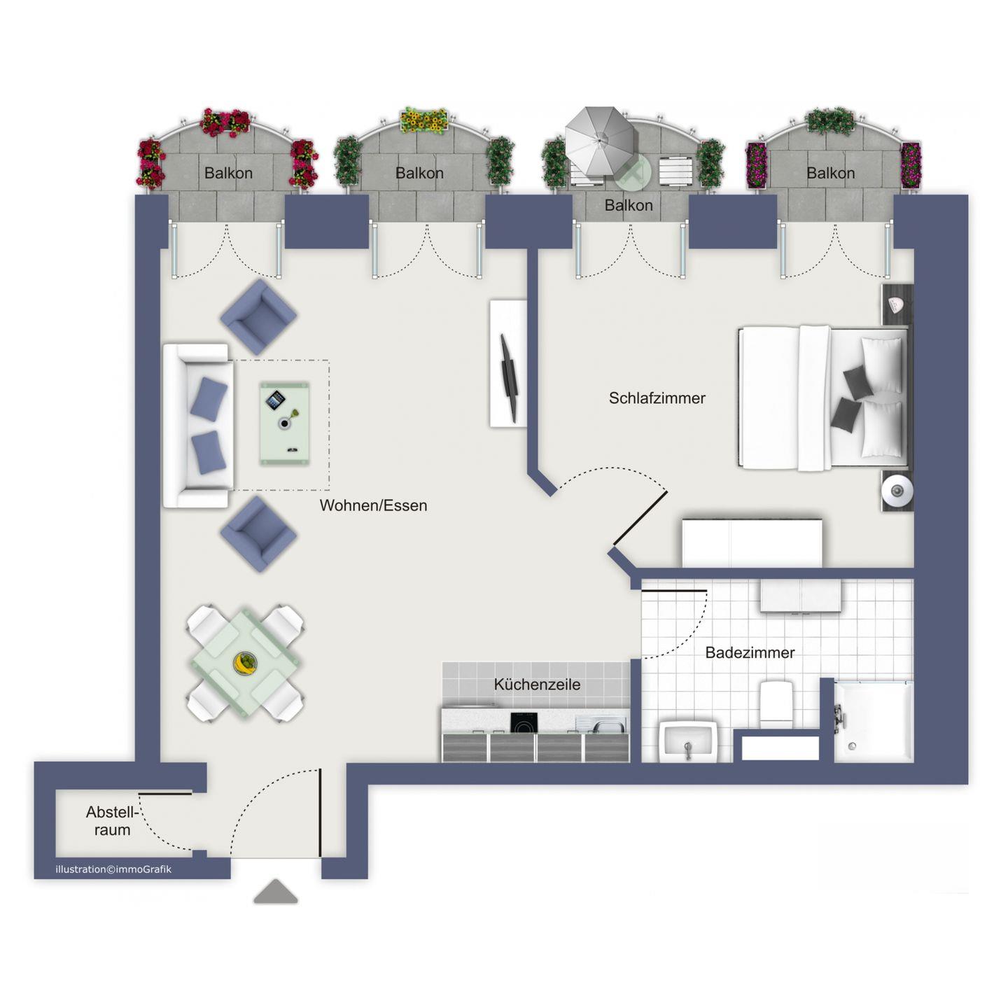 Im Wohnbereich kannst du es dir auf der Doppelschlafcouch (160 x 200 cm) gemütlich machen. Ein Flachbild-TV steht dir ebenfalls zur Verfügung. Alternativ kannst du von hier aus auch den Balkon betreten und die Zeit dort genießen.