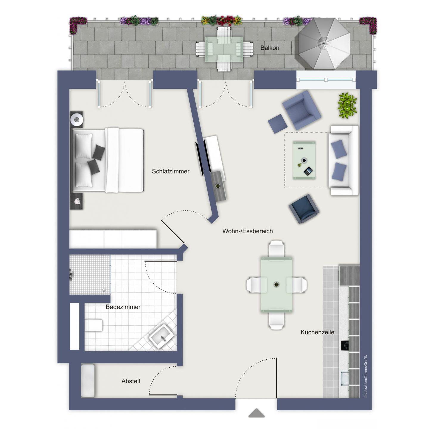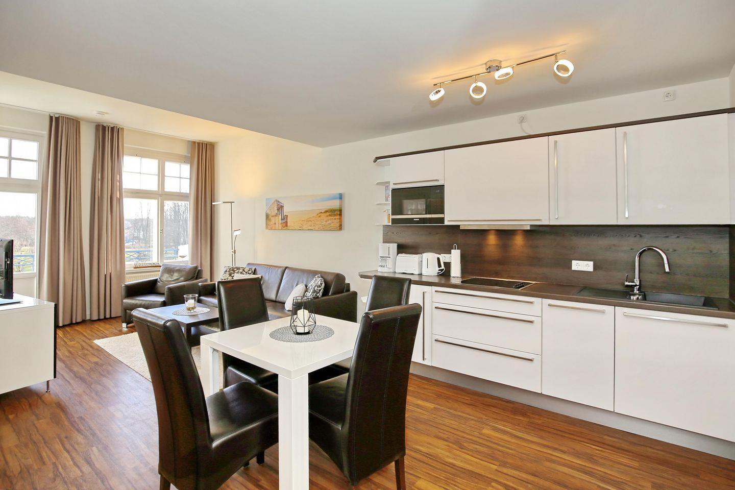 Die stilvoll eingerichtete Wohnung mit etwa 45 m² befindet sich im 2. Obergeschoss und ist bequem über einen Fahrstuhl zu erreichen. Ein großzügiger Balkon mit seitlichem Seeblick und wunderbarem Blick über die Kolonnaden ist sowohl vom Wohnbereich als auch vom Schlafzimmer aus erreichbar. Die Entfernung zum Ostseestrand beträgt nur etwa 50 m.