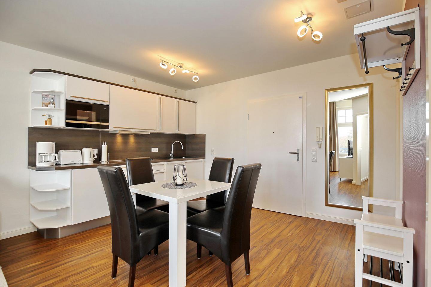 Die moderne Küchenzeile ist mit vier Ceran-Kochfeldern, Kühlschrank mit Gefrierfach, Mikrowelle, Toaster, Wasserkocher, Kaffeemaschine und einem Geschirrspüler ausgestattet. Im Essbereich können 4 Personen Platz nehmen.
